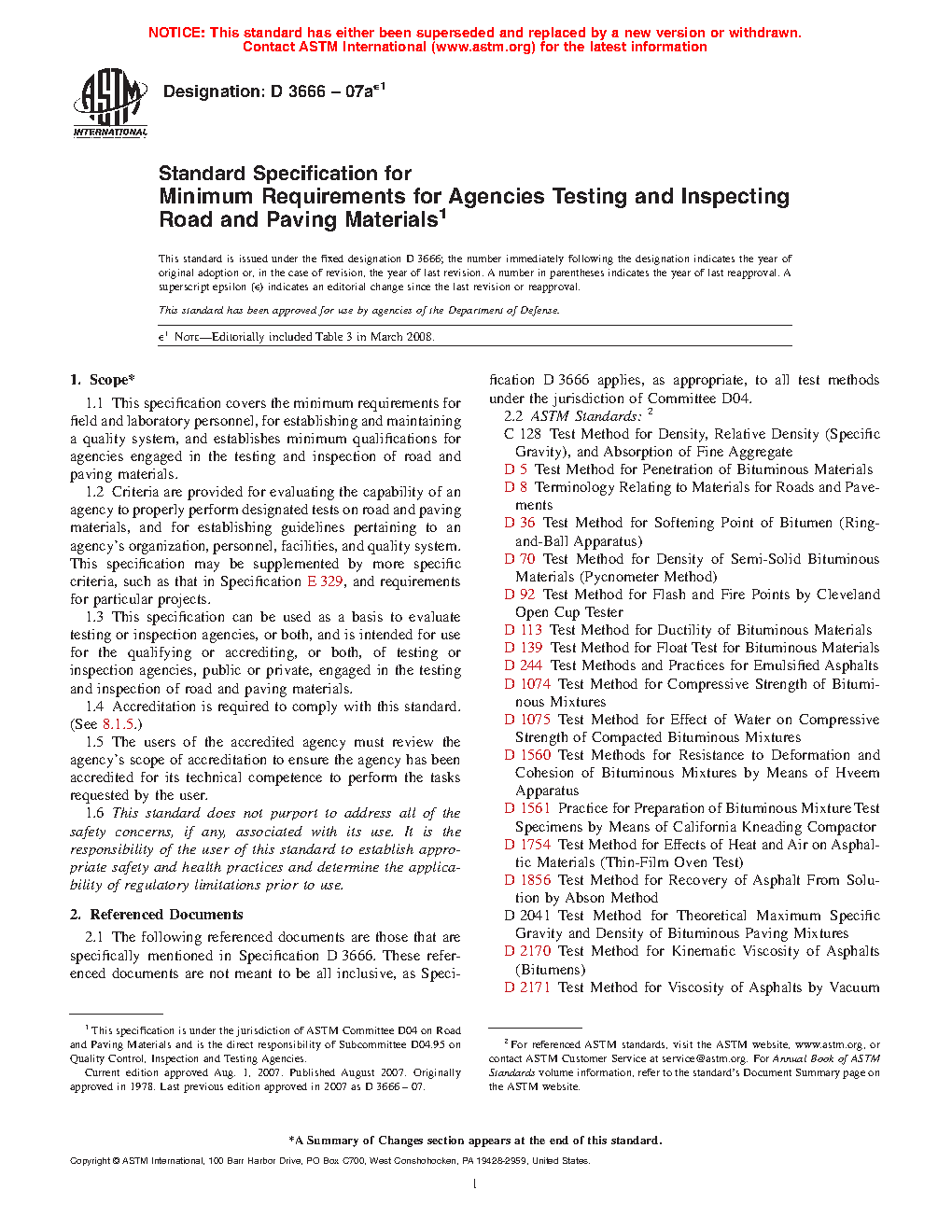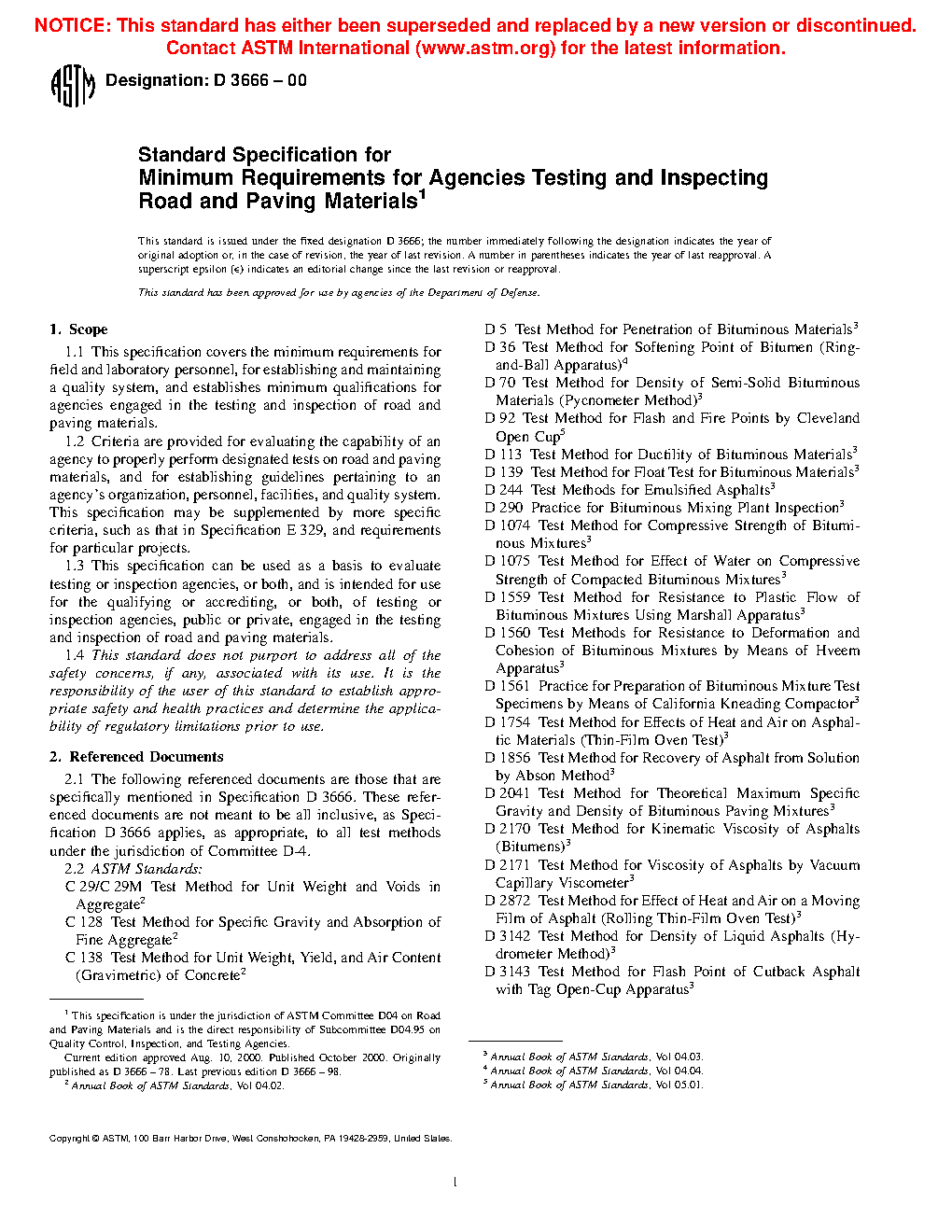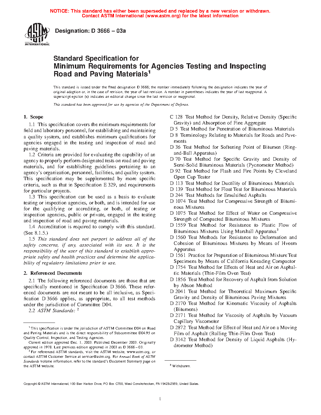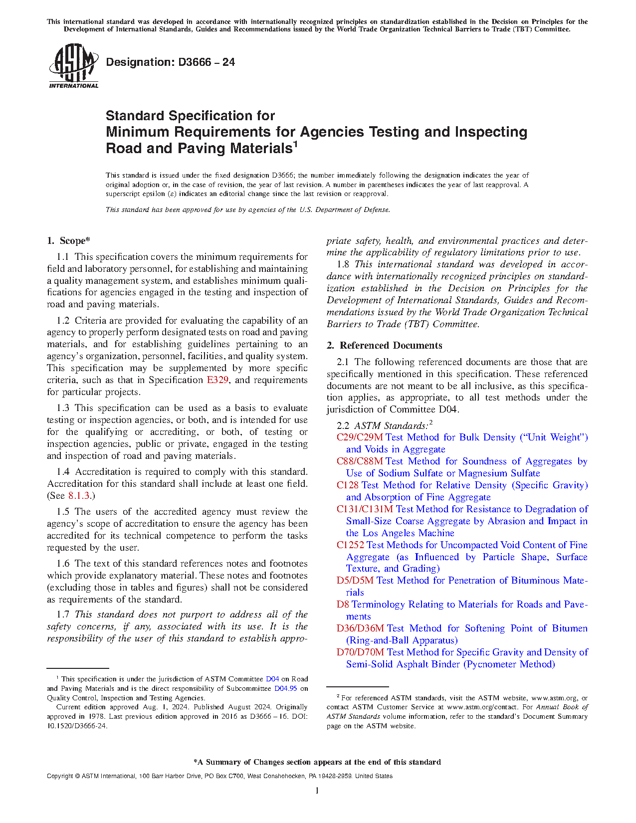 1.1 This specification covers the minimum requirements for field and laboratory personnel, for establishing and maintaining a quality system, and establishes minimum qualifications for agencies engaged in the testing and inspection of road and paving materials.