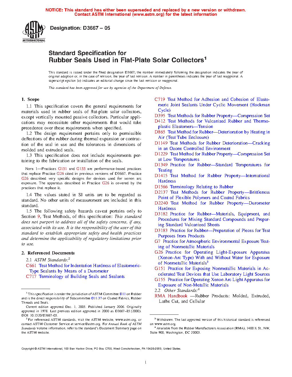 This specification covers the general requirements for materials used in rubber seals of flat-plate solar collectors, except vertically mounted passive collectors. Particular applications may necessitate other requirements that would take precedence over these requirements when specified. The rubber seals are classified into types, grades, and classes: type C - intended for use in cold climates, and type W - intended for use in warm climates; grades 2, 3, 4, 5, 6, 7, and 8 that differ in hardness properties; class PS - preformed rubber seal, and class SC - sealing compound. Seals shall be rubber vulcanizates conforming to the requirements prescribed. The adhesion, volatiles lost, and volatiles condensable shall be tested to meet the requirements prescribed.
