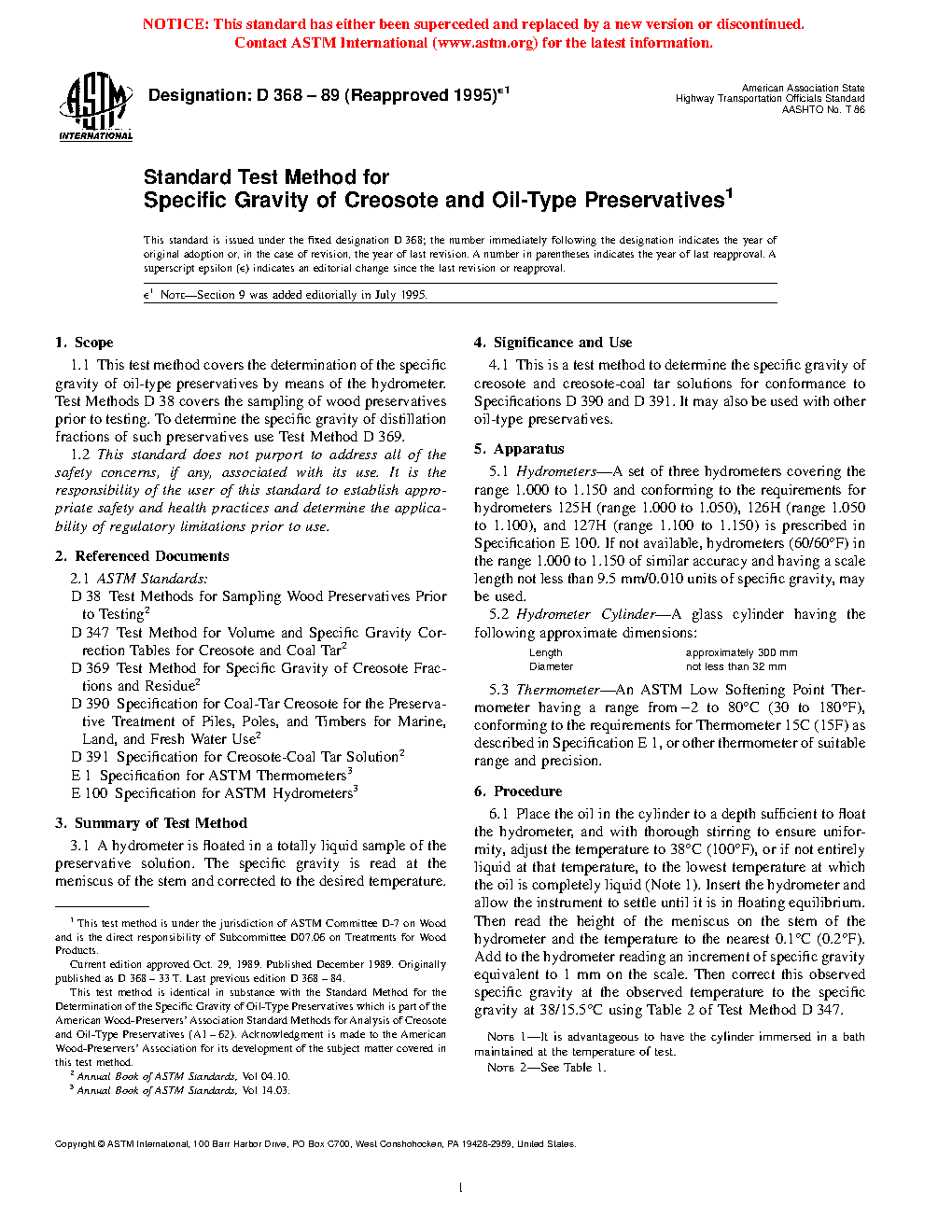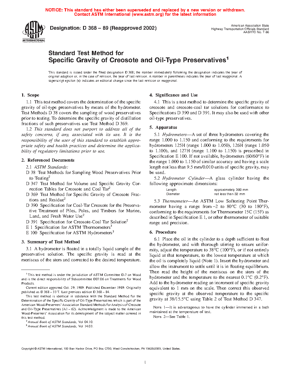 1.1 This test method covers the determination of the specific gravity of oil-type preservatives by means of the hydrometer. Test Methods D38 covers the sampling of wood preservatives prior to testing. To determine the specific gravity of distillation fractions of such preservatives use Test Method D369.