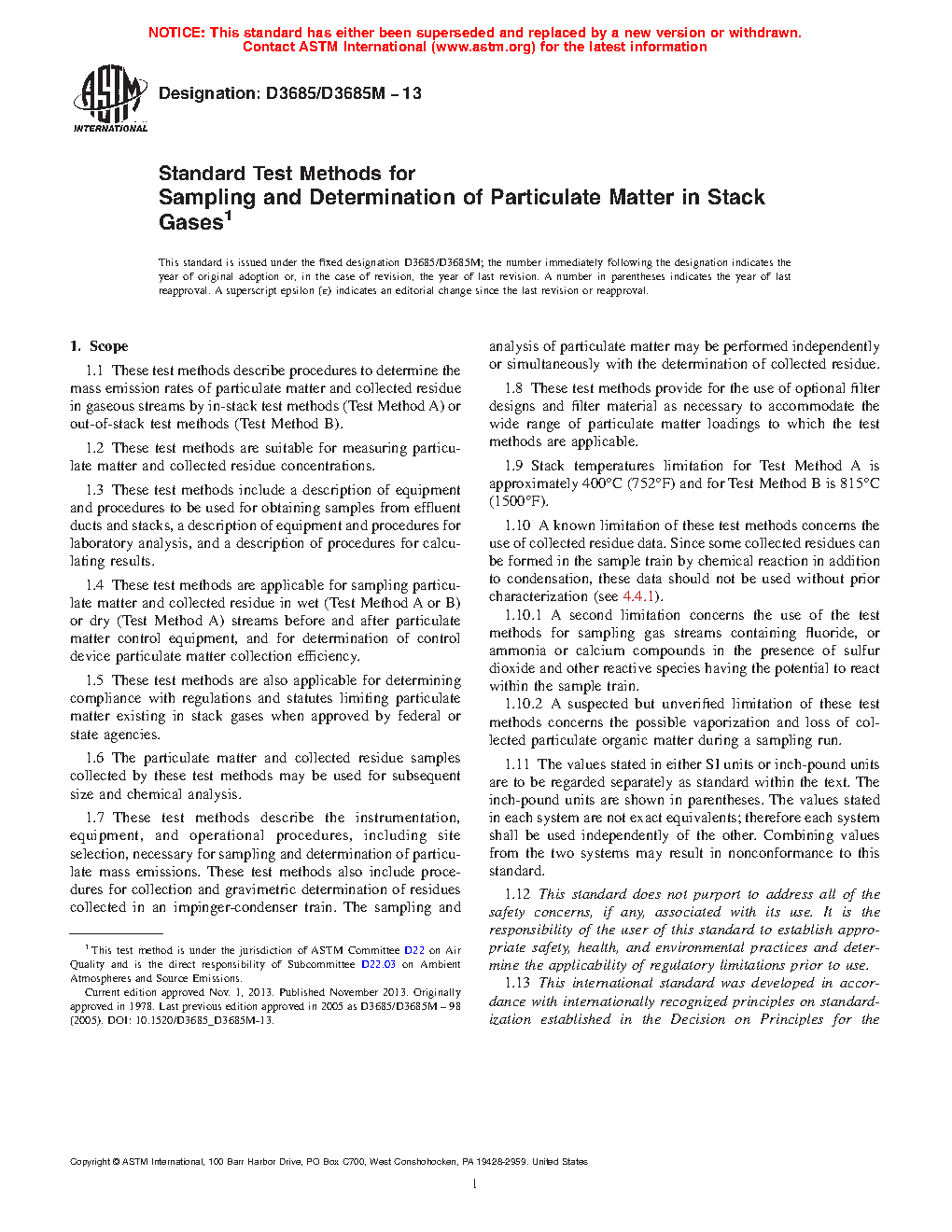 1.7 These test methods describe the instrumentation, equipment, and operational procedures, including site selection, necessary for sampling and determination of particulate mass emissions. These test methods also include procedures for collection and gravimetric determination of residues collected in an impinger-condenser train. The sampling and analysis of particulate matter may be performed independently or simultaneously with the determination of collected residue.