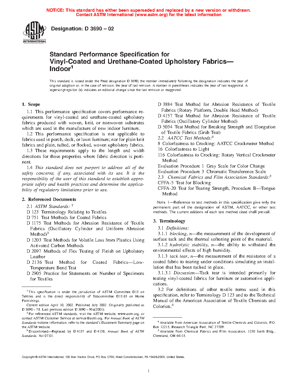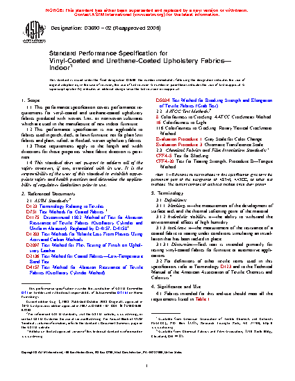 1.1 This performance specification covers performance requirements for vinyl-coated and urethane-coated upholstery fabrics produced with woven, knit, or nonwoven substrates which are used in the manufacture of new indoor furniture.