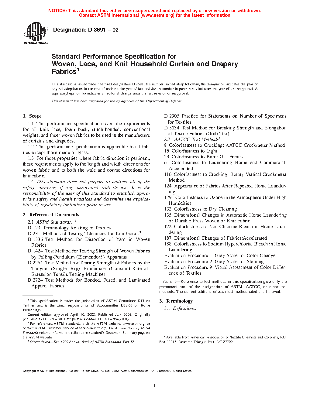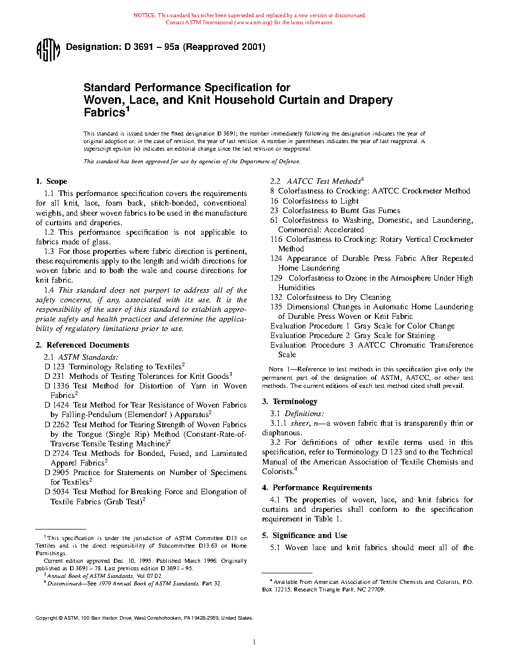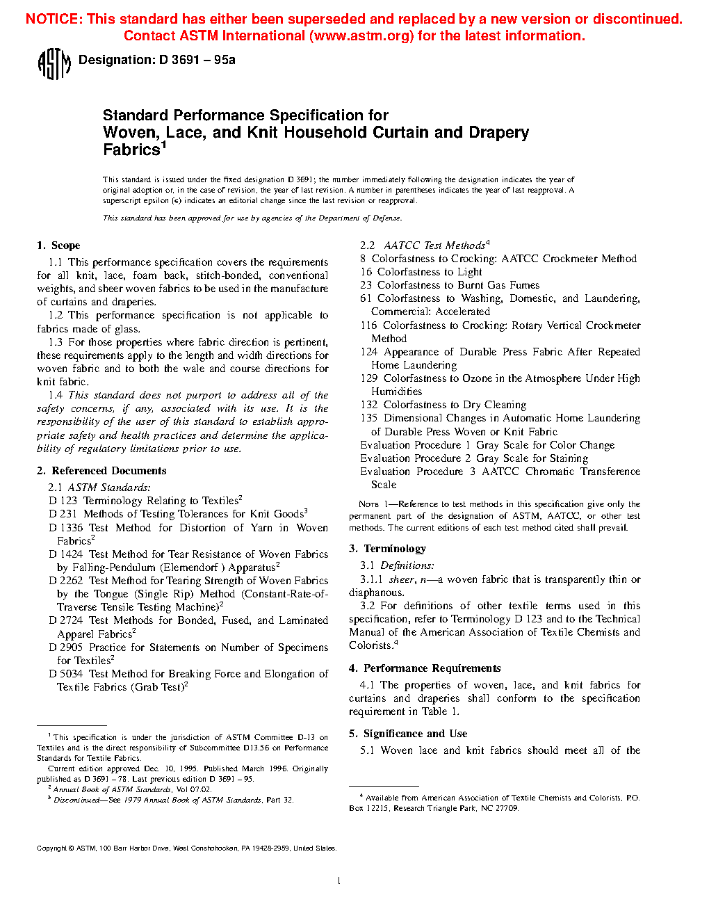 1.1 This performance specification covers the requirements for all knit, lace, foam back, stitch-bonded, conventional weights, and sheer woven fabrics to be used in the manufacture of curtains and draperies.