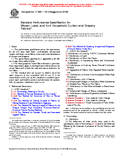 1.1 This performance specification covers the requirements for all knit, lace, foam back, stitch-bonded, conventional weights, and sheer woven fabrics to be used in the manufacture of curtains and draperies.