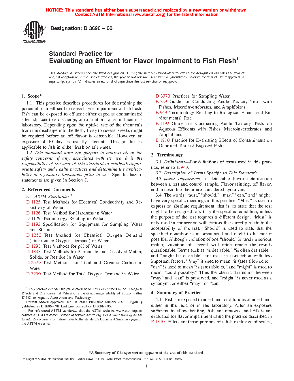 1.1 This practice describes procedures for determining the potential of an effluent to cause flavor impairment of fish flesh. Fish can be exposed to effluent either caged at contaminated sites adjacent to a discharge, or to dilutions of an effluent in a laboratory. Depending upon the uptake rate of the chemicals from the discharge into the flesh, 1 day to several weeks might be required before an off flavor is detectable. However, an exposure of 10 days is usually adequate. This practice is applicable to fish in either fresh or salt water.