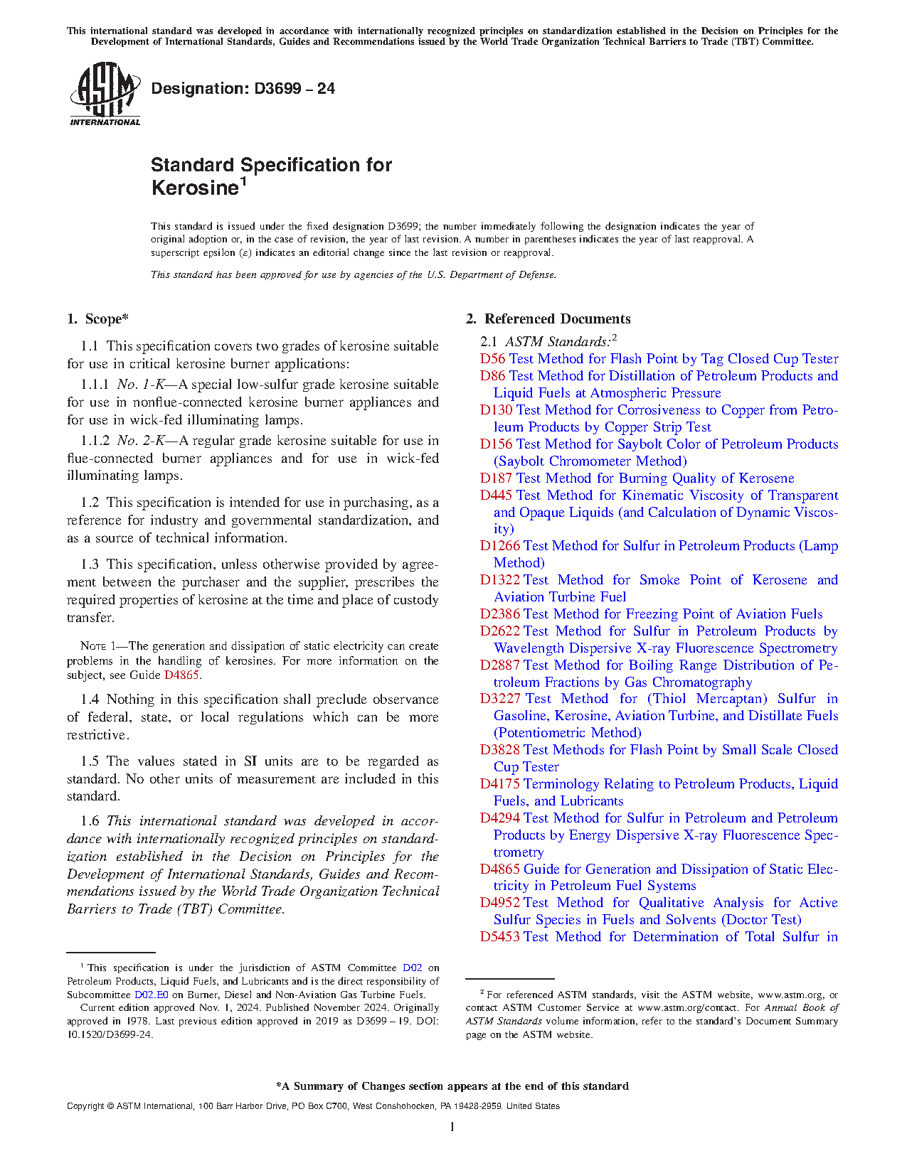 1.1 This specification covers two grades of kerosine suitable for use in critical kerosine burner applications: