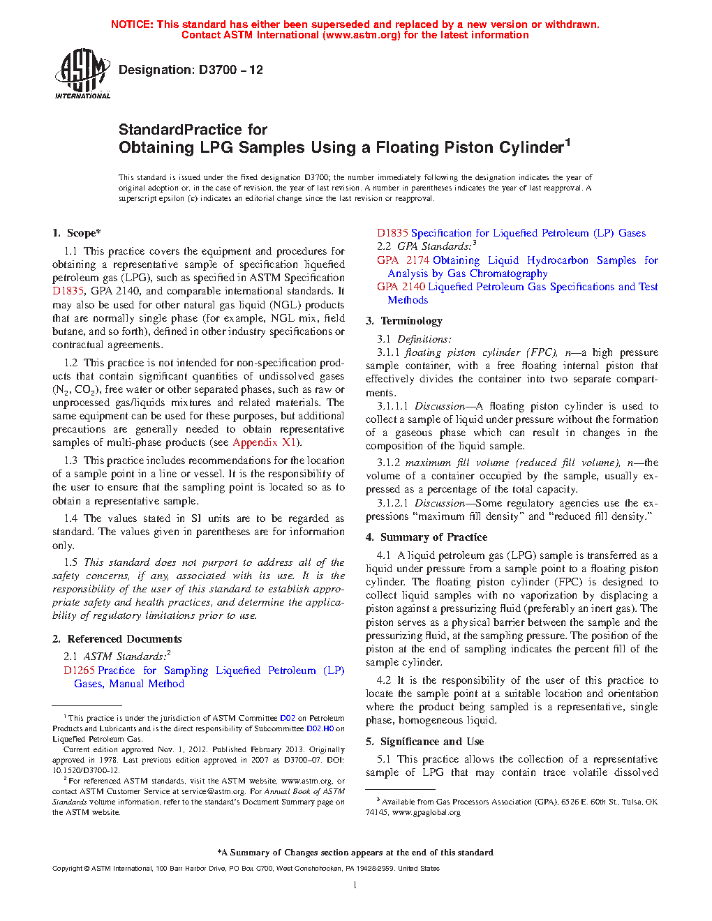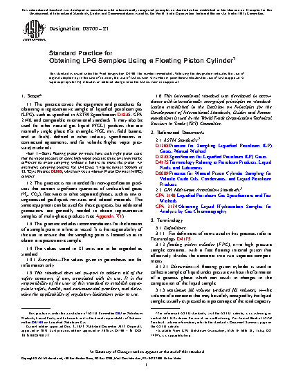 1.1 This practice covers the equipment and procedures for obtaining a representative sample of specification liquefied petroleum gas (LPG), such as specified in Specification D 1835, GPA 2140, and comparable international standards. It may also be used for other natural gas liquid (NGL) products that are normally single phase (NGL mix, field butane, and so forth), defined in other industry specifications or contractual agreements.