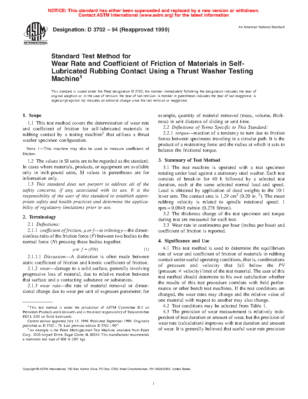 1.1 This test method covers the determination of wear rate and coefficient of friction for self-lubricated materials in rubbing contact by a testing machine2 that utilizes a thrust washer specimen configuration.