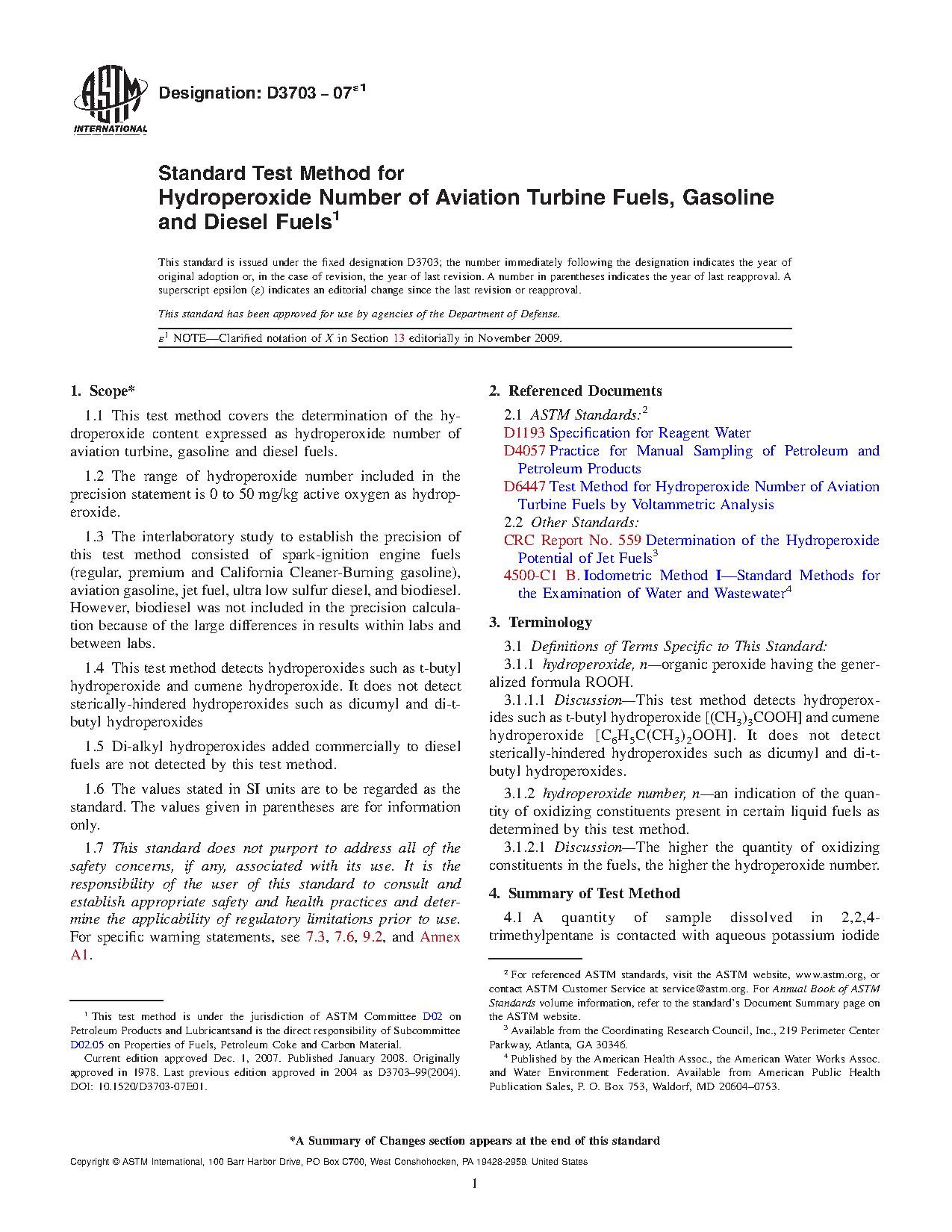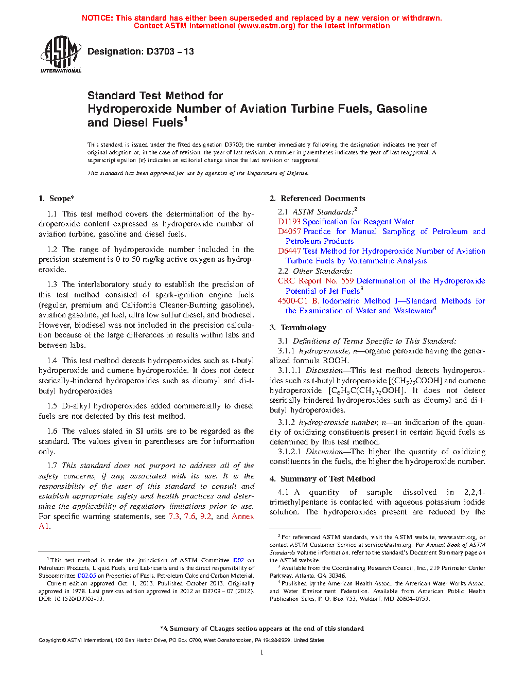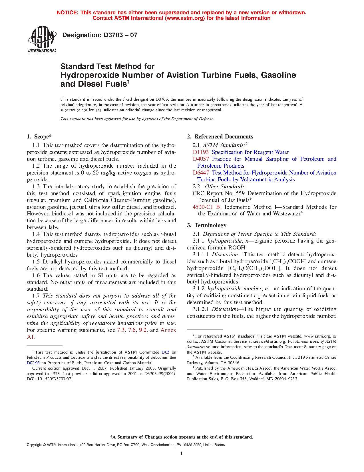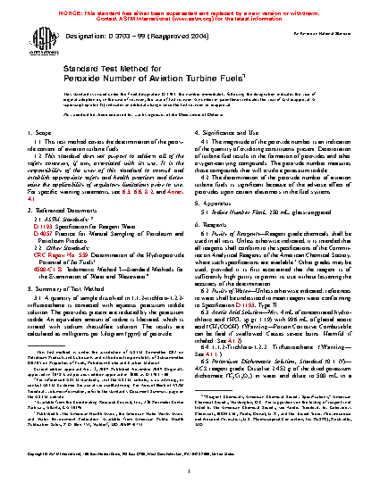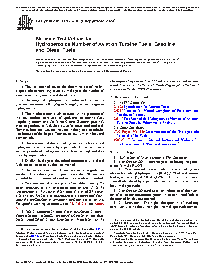 1.1 This test method covers the determination of the hydroperoxide content expressed as hydroperoxide number of aviation turbine, gasoline and diesel fuels.