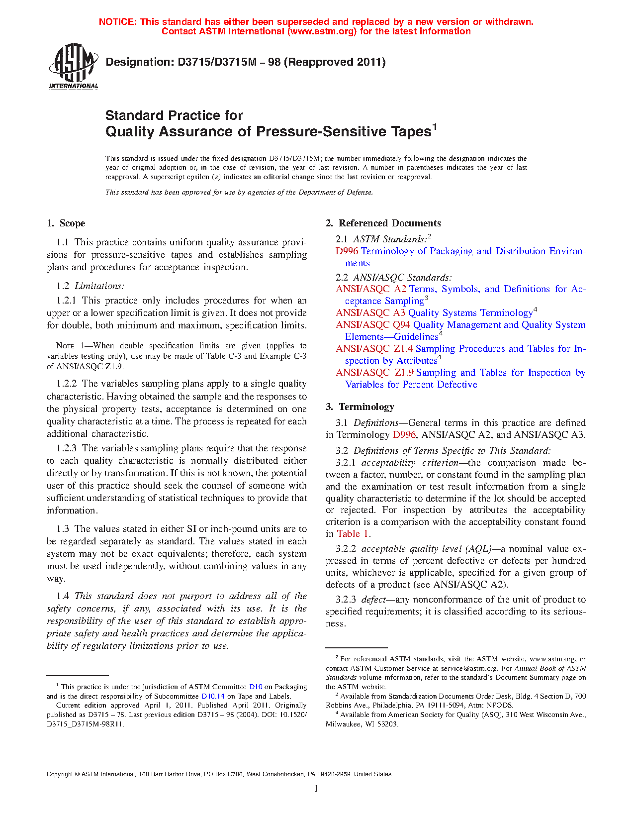 4.1 The quality of a tape product is determined by the quality systems of the tape producer, including all processes involved in the engineering and production of the product. It is recommended that appropriate sections of ANSI/ASQC Q94 be included in a producer's quality systems. This practice does not intend to standardize these systems. A producer's reputation, a producer's certification of conformance, or evidence of a producer's quality systems are often sufficient to ensure a purchaser or user of a consistent quality. Acceptance sampling is useful when an objective basis of contract or specification conformance is desired.