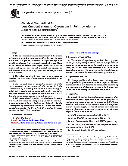 1.1 This test method covers the determination of the content of chromium (including chromium oxide) in the range between 0.005 and 1.0 % present in the solids of liquid coatings or in dried films obtained from previously coated substrates. There is no reason to believe that higher levels could not be determined by this test method, provided that appropriate dilutions and adjustments in specimen size and reagent quantities are made.