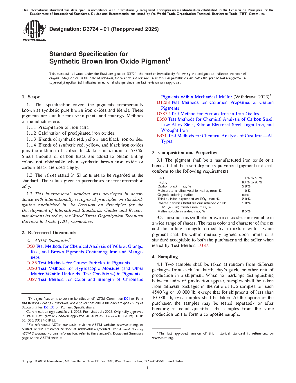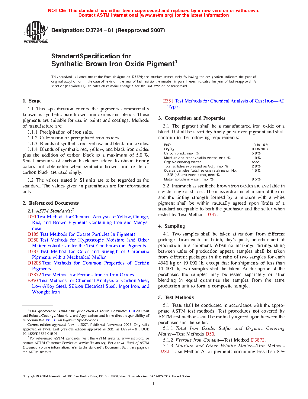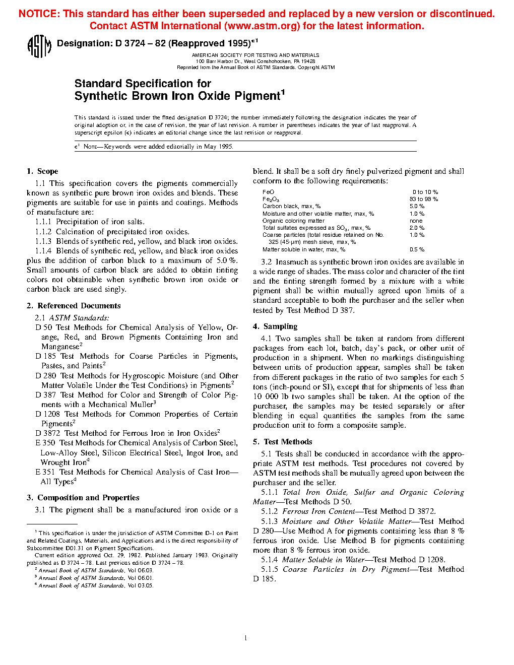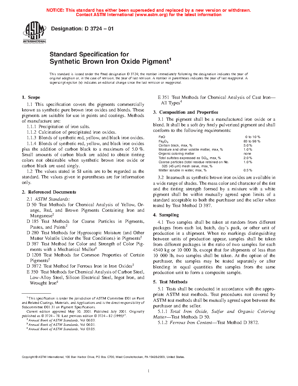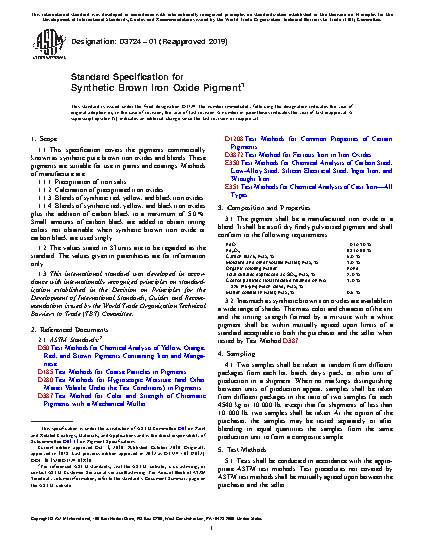 This specification establishes the properties and requirements for the pigments commercially known as synthetic pure brown iron oxides and its blends, suitable for use in paints and coatings. The pigment, which shall be soft, dry, and finely pulverized, may be manufactured by either of the following methods: precipitation of iron salts; calcination of precipitated iron oxides; blends of synthetic red, yellow, and black iron oxides; and blends of synthetic red, yellow, and black iron oxides plus the addition of carbon black. Specimens shall be suitably sampled and tested, and shall adhere to specified requirements as to total iron oxide, ferrous iron, carbon black, moisture and other volatile matter, organic coloring matter, total sulfates, coarse particles (total residue retained on No. 325 sieve), and water-soluble matter.