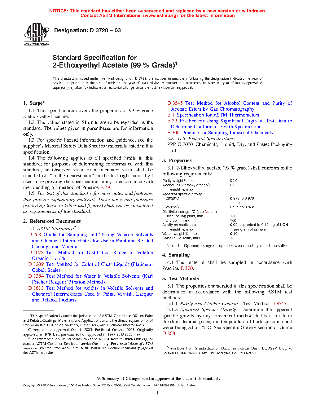 This specification establishes the properties and requirements for 99 % grade 2-ethoxyethyl acetate. The specimens shall be adequately sampled and undergo chemical analysis, and shall adhere accordingly to chemical property requirements as to purity, alcohol content, color (Pt-Co scale), water content, distillation range (initial boiling and dry points), acidity as acetic acid, and apparent specific gravity.