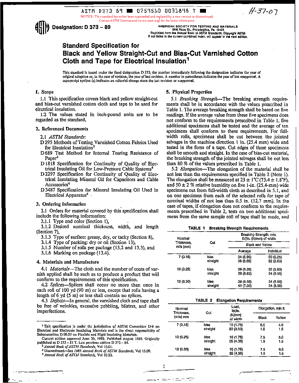Specification for Black and Yellow Straight-Cut and Bias-Cut Varnished Cotton Cloth and Tape for Electrical Insulation