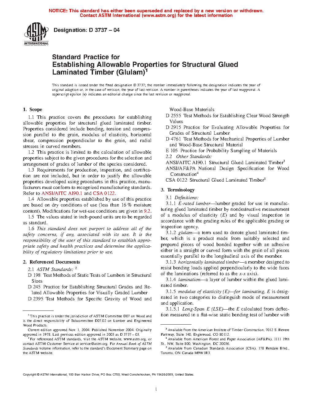 1.3 Requirements for production, inspection and certification are not included, but in order to justify the allowable properties developed using procedures in this practice, manufacturers must conform to recognized manufacturing standards. Refer to ANSI/AITC A190.1 and CSA 0122.