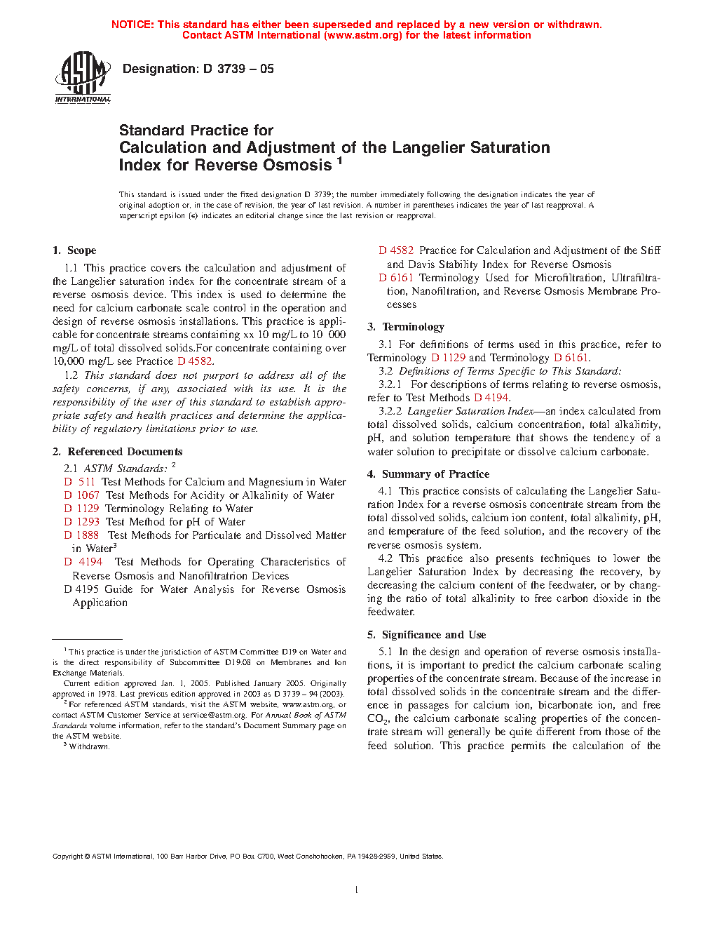 1.1 This practice covers the calculation and adjustment of the Langelier saturation index for the concentrate stream of a reverse osmosis (RO) device. This index is used to determine the need for calcium carbonate (CaCo3) scale control in the operation and design of RO installations. This practice is applicable for concentrate streams containing 10 to 10 000 mg/L of total dissolved solids. For concentrate containing over 10 000 mg/L, see Practice D4582.