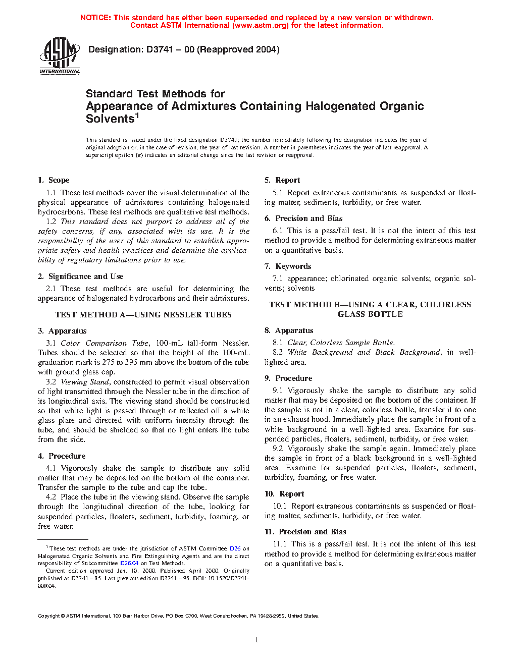 1.1 These test methods cover the visual determination of the physical appearance of admixtures containing halogenated hydrocarbons. These test methods are qualitative test methods.