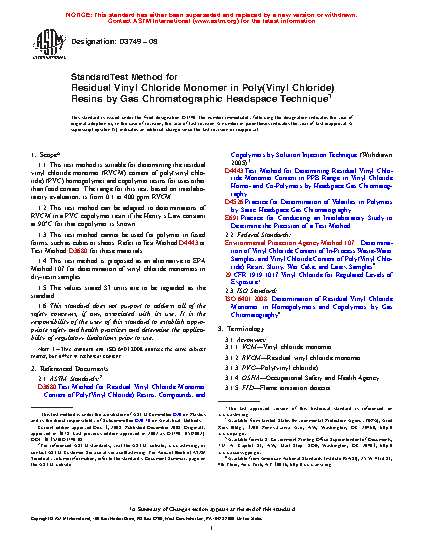 1.1 This test method is suitable for determining the residual vinyl chloride monomer (RVCM) content of poly(vinyl chloride) (PVC) homopolymer and copolymer resins. The range for this test, based on interlaboratory evaluation, is from 0.1 to 400 ppm RVCM.