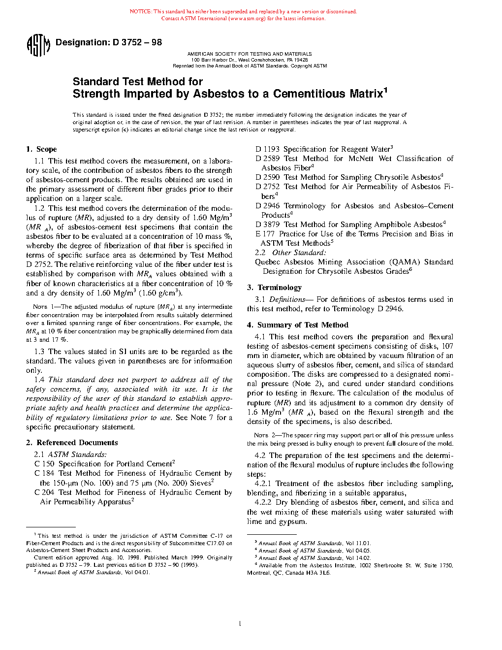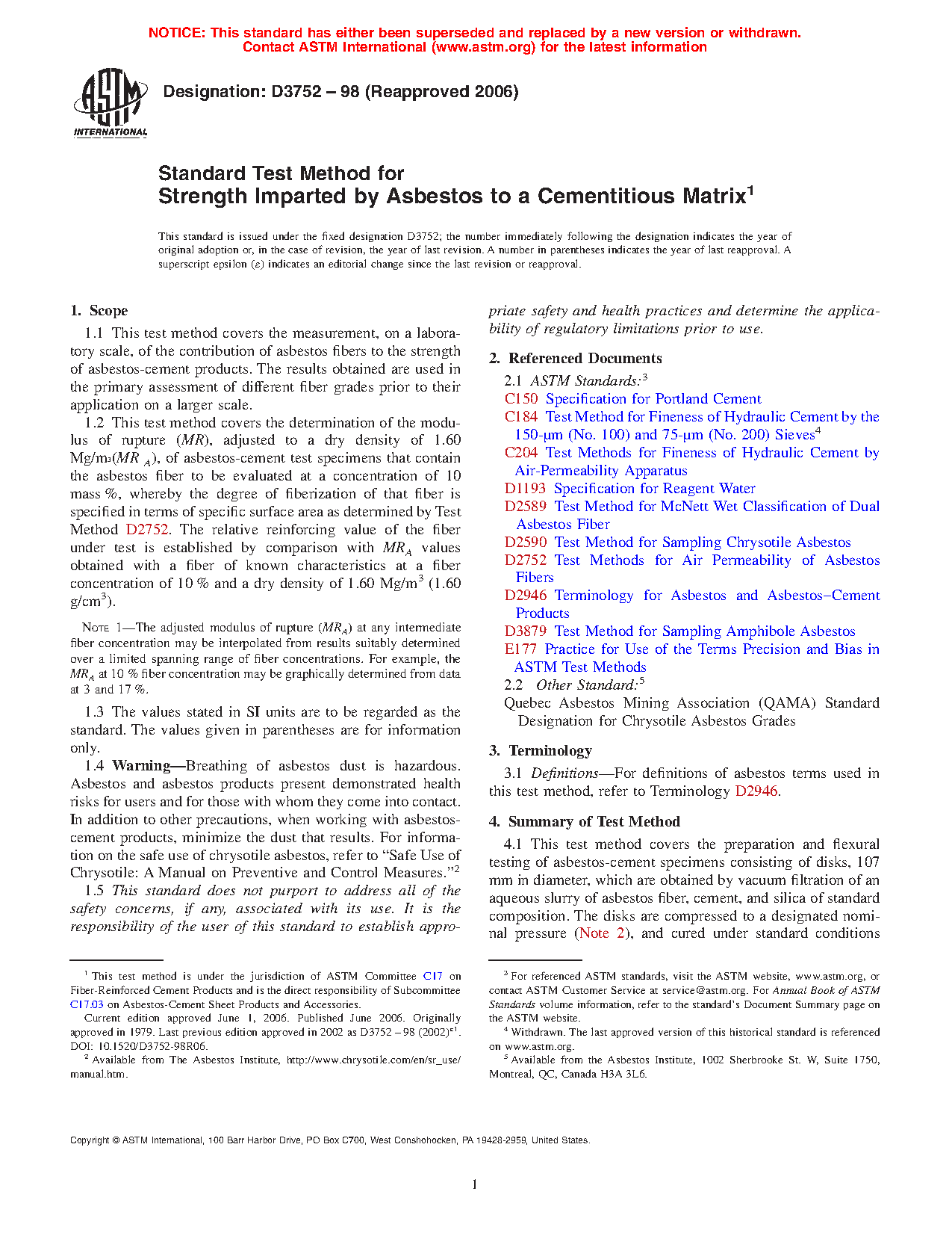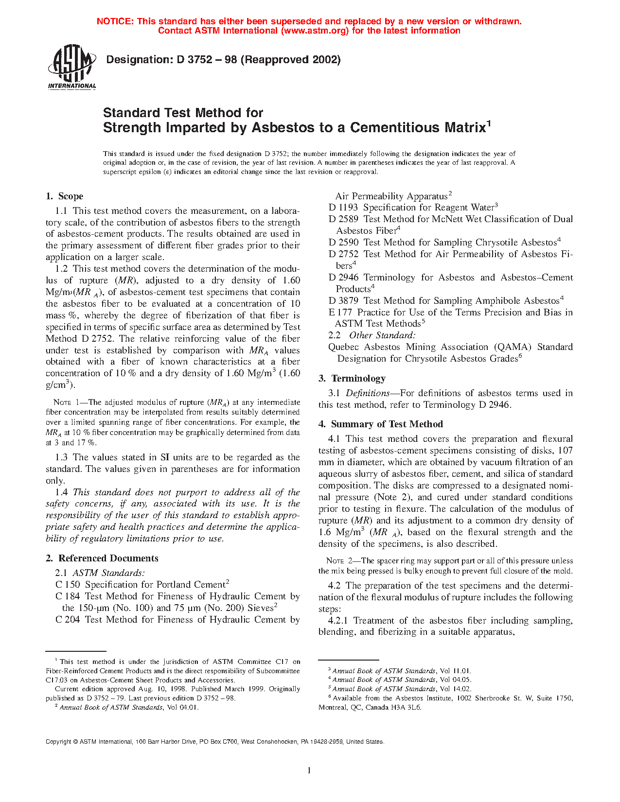 1.2 This test method covers the determination of the modulus of rupture (MR), adjusted to a dry density of 1.60 Mg/m3 (MR A), of asbestos-cement test specimens that contain the asbestos fiber to be evaluated at a concentration of 10 mass %, whereby the degree of fiberization of that fiber is specified in terms of specific surface area as determined by Test Method D2752. The relative reinforcing value of the fiber under test is established by comparison with MRA values obtained with a fiber of known characteristics at a fiber concentration of 10 % and a dry density of 1.60 Mg/m3 (1.60 g/cm3).