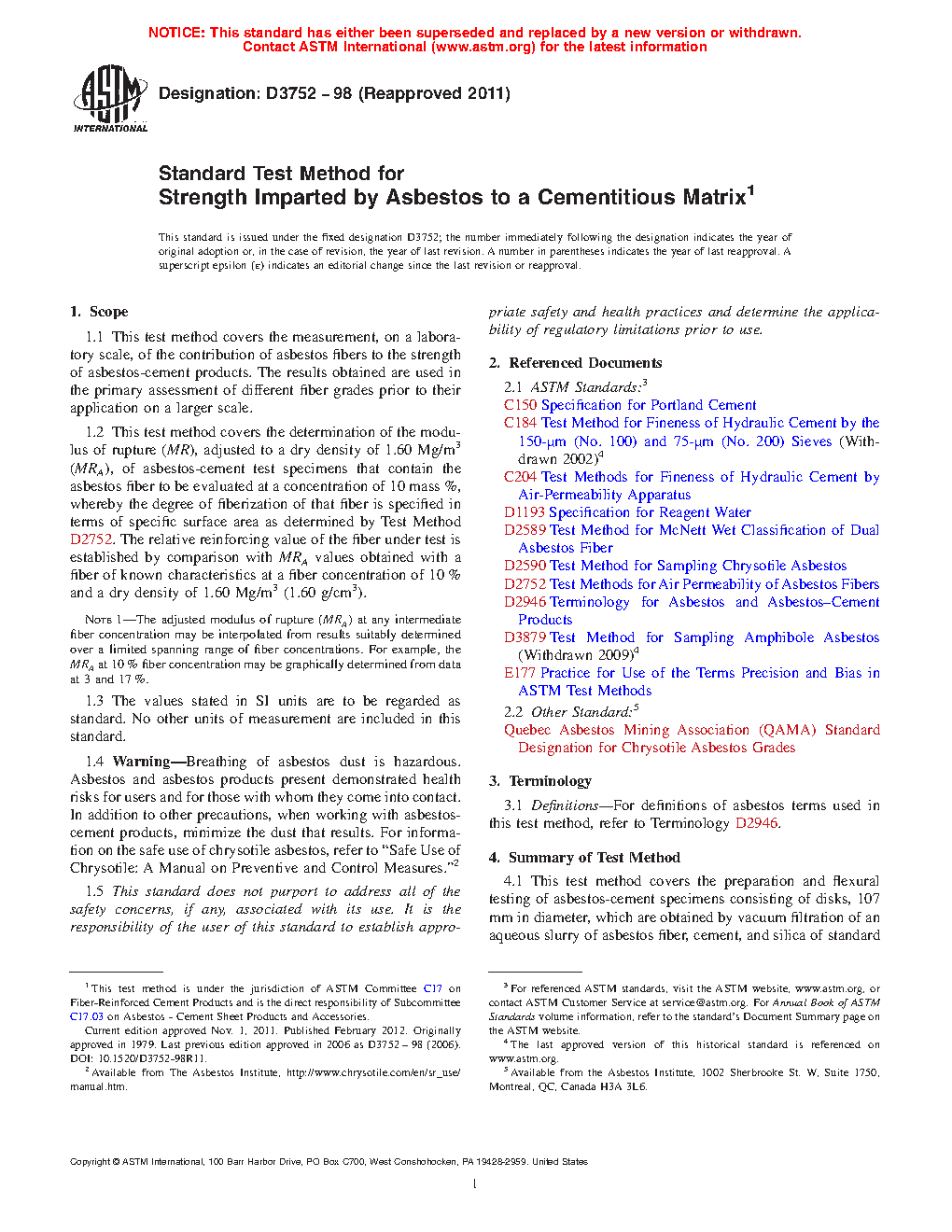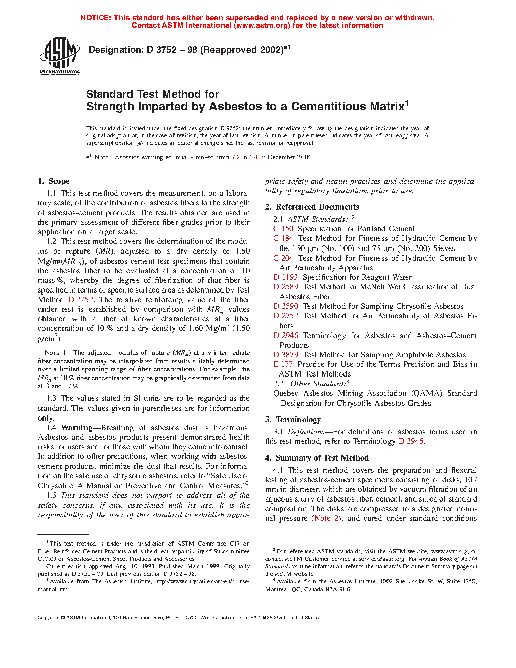 1.4 Warning—Breathing of asbestos dust is hazardous. Asbestos and asbestos products present demonstrated health risks for users and for those with whom they come into contact. In addition to other precautions, when working with asbestos-cement products, minimize the dust that results. For information on the safe use of chrysotile asbestos, refer to “Safe Use of Chrysotile: A Manual on Preventive and Control Measures.”