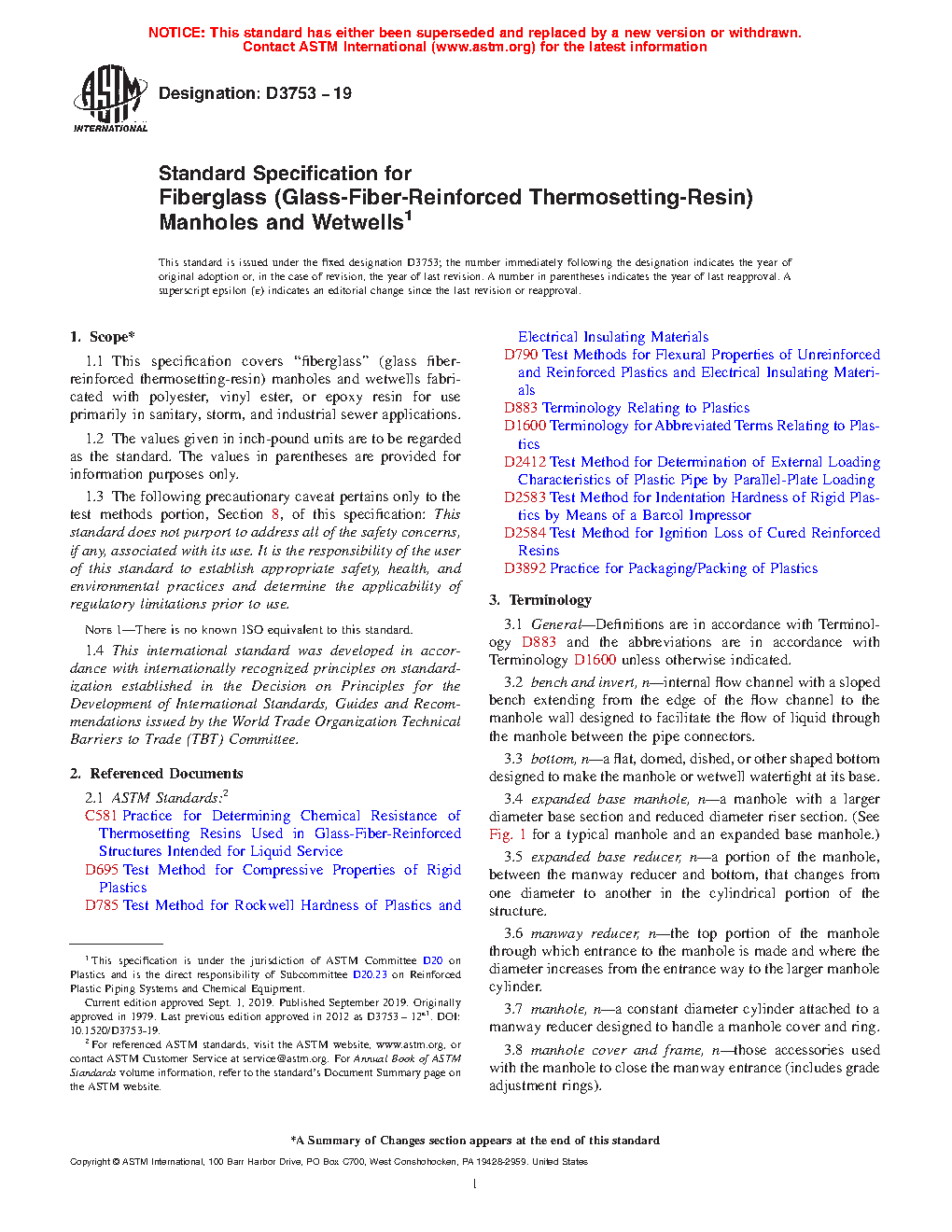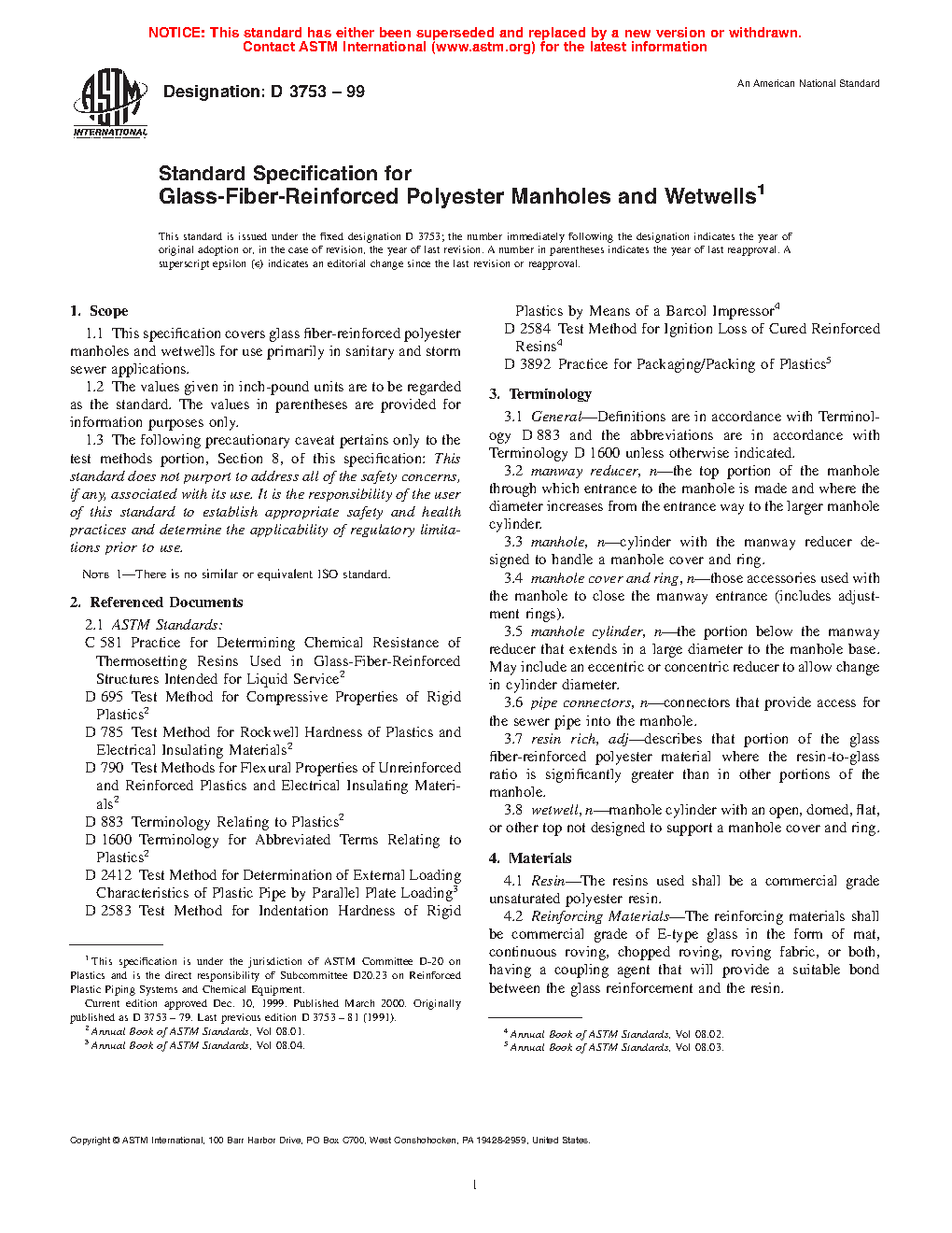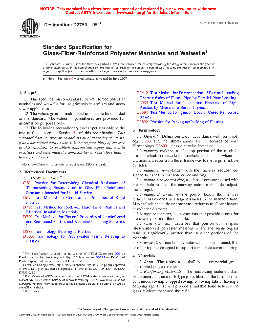 This specification covers glass fiber-reinforced polyester manholes and wetwells for use primarily in sanitary and storm sewer applications. Manhole and wetwell cylinders, manway reducers, and connectors shall be produced from glass fiber-reinforced polyester resin with construction determined by the particular process of manufacture and configuration. The stiffness, soundness, chemical resistance, compressive strength, flexural strength, modulus, and hardness shall be tested to meet the requirements prescribed.
