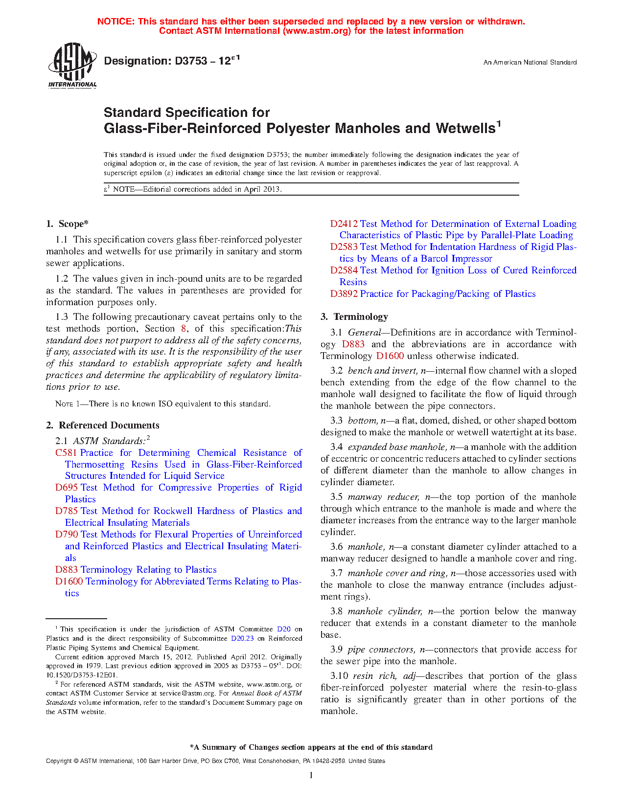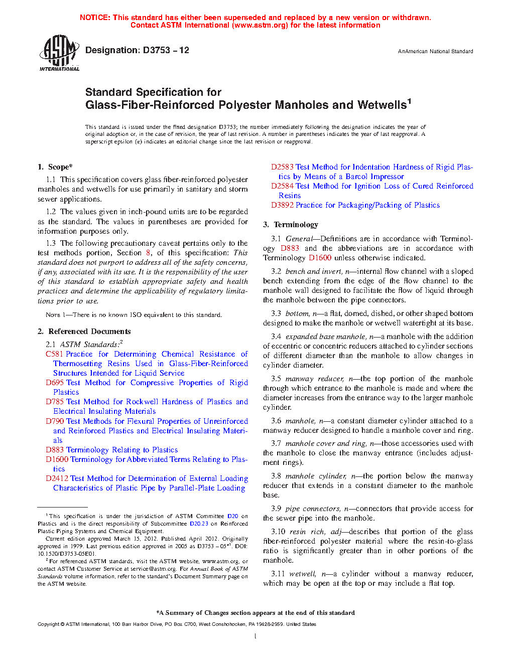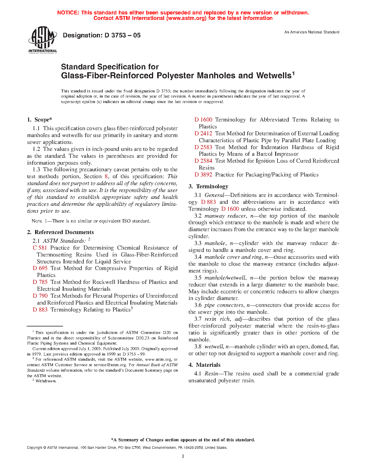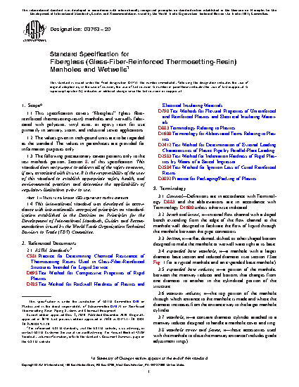 1.1 This specification covers glass fiber-reinforced polyester manholes and wetwells for use primarily in sanitary and storm sewer applications.