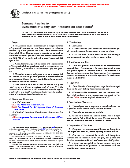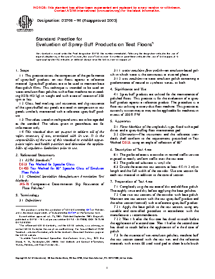 1.1 This practice covers the comparison of the performance of spray-buff products on test floors against a reference material. Spray-buff products are to be used to maintain base floor-polish films. This technique is intended to be used on water-emulsion floor polishes with a floor machine not ex- ceeding 95 lb (43 kg) in weight and with a rate of rotation of 350 rpm or less.