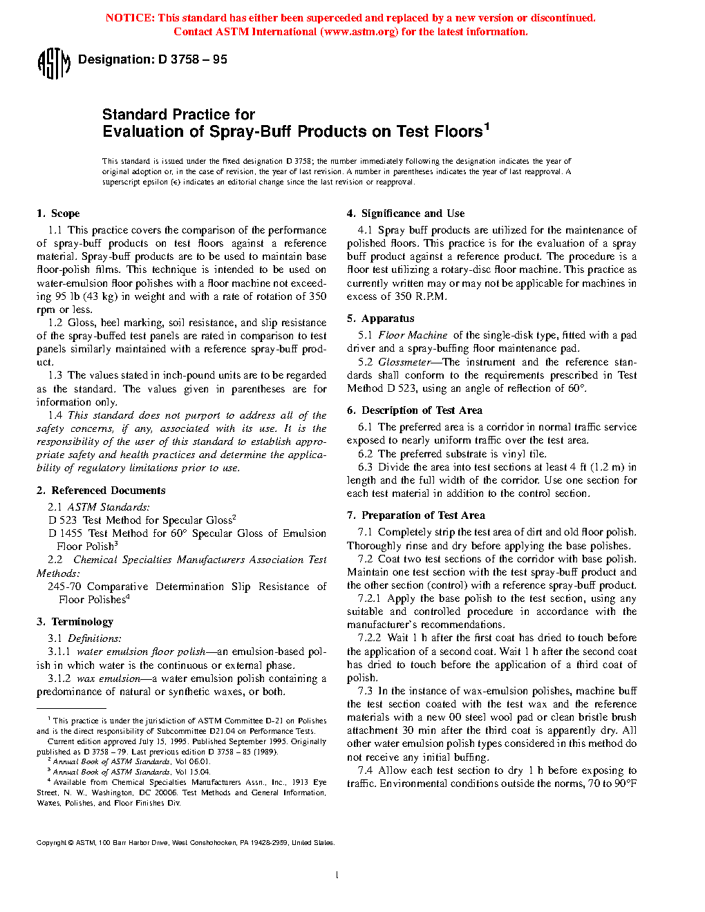 1.2 Gloss, heel marking, soil resistance, and slip resistance of the spray-buffed test panels are rated in comparison to test panels similarly maintained with a reference spray-buff prod- uct.