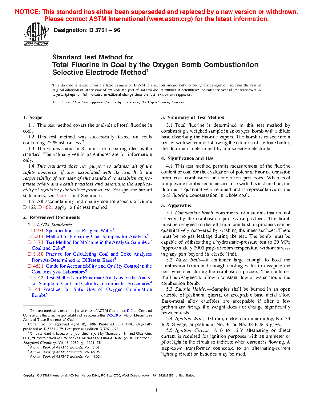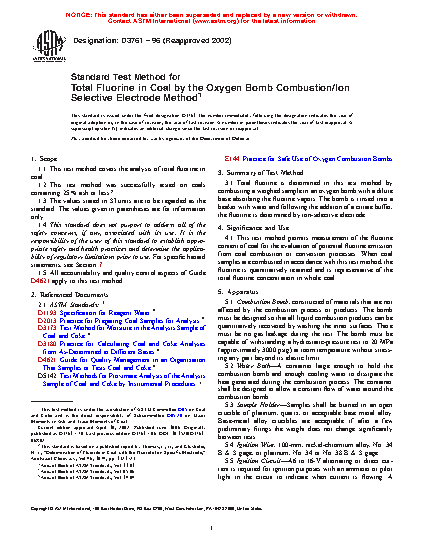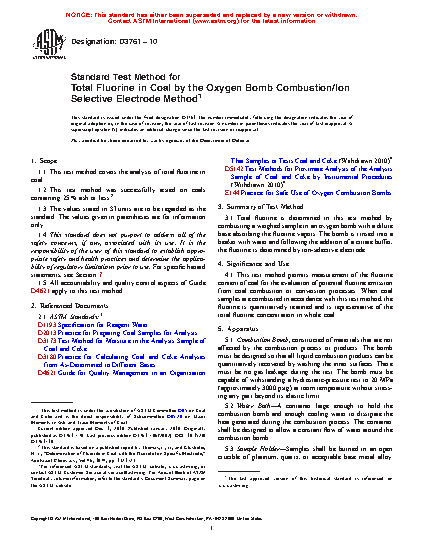 This test method permits measurement of the fluorine content of coal for the evaluation of potential fluorine emission from coal combustion or conversion processes. When coal samples are combusted in accordance with this test method, the fluorine is quantitatively retained and is representative of the total fluorine concentration in whole coal.