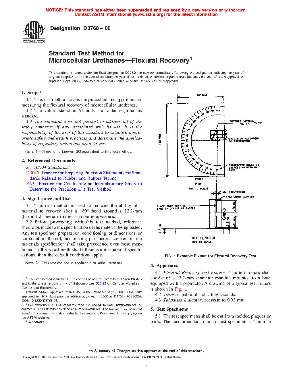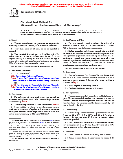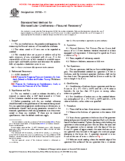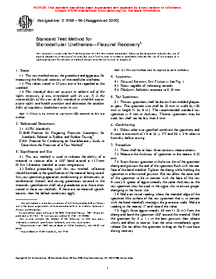 1.1 This test method covers the procedure and apparatus for measuring the flexural recovery of microcellular urethanes.