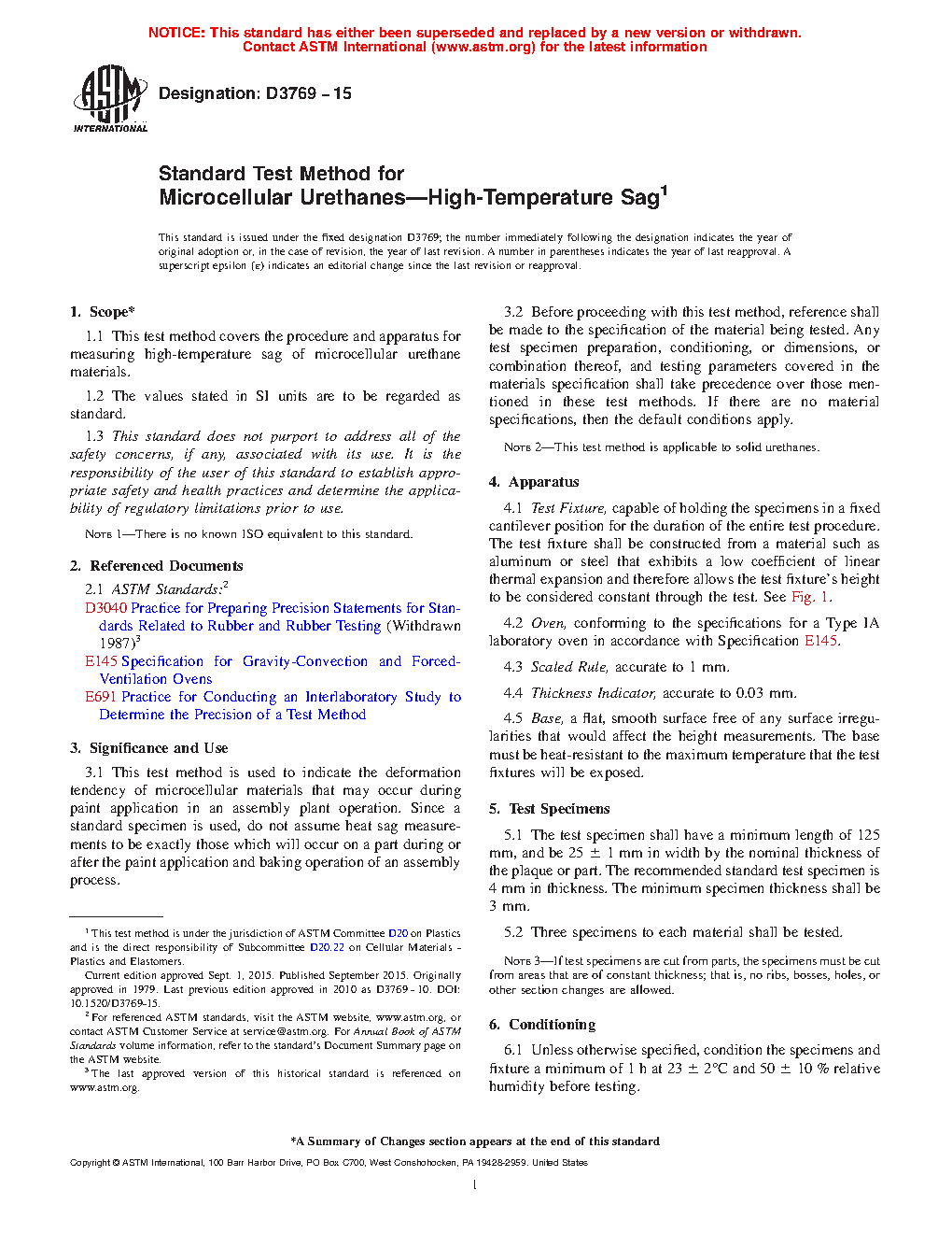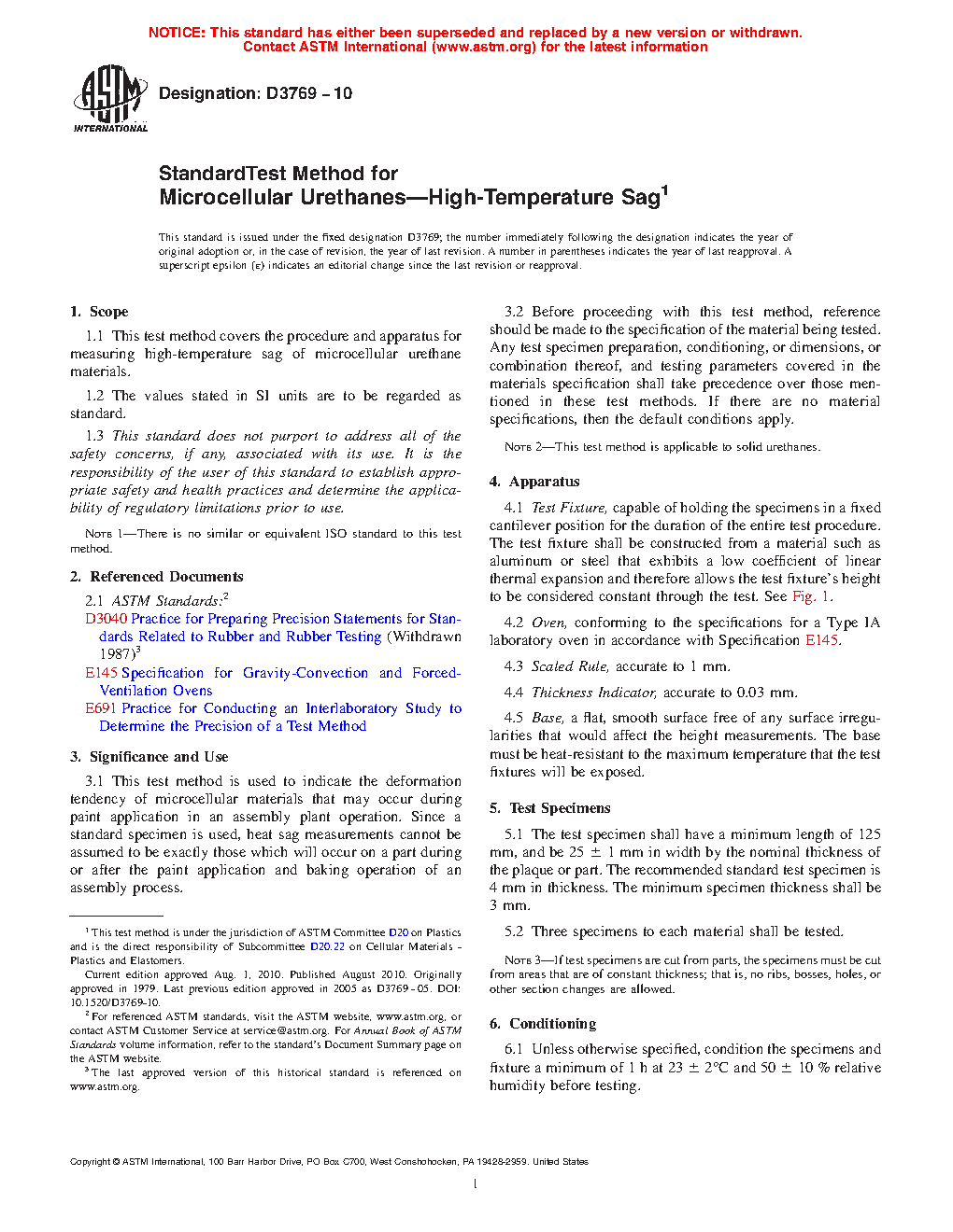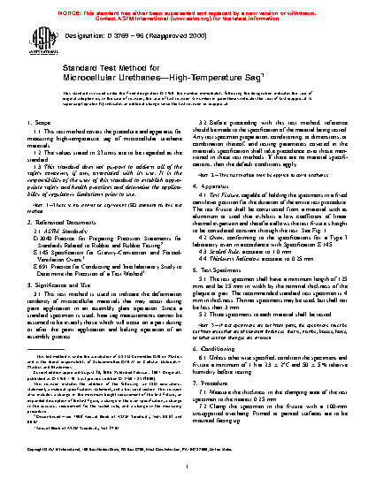 1.1 This test method covers the procedure and apparatus for measuring high-temperature sag of microcellular urethane materials.