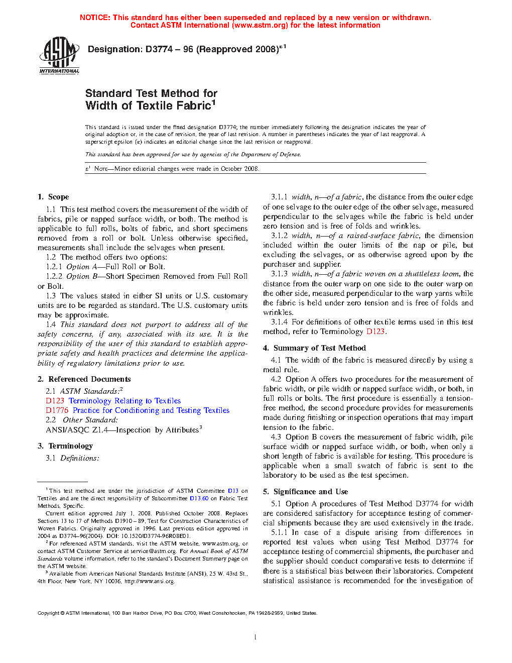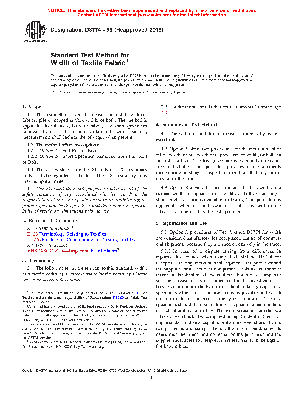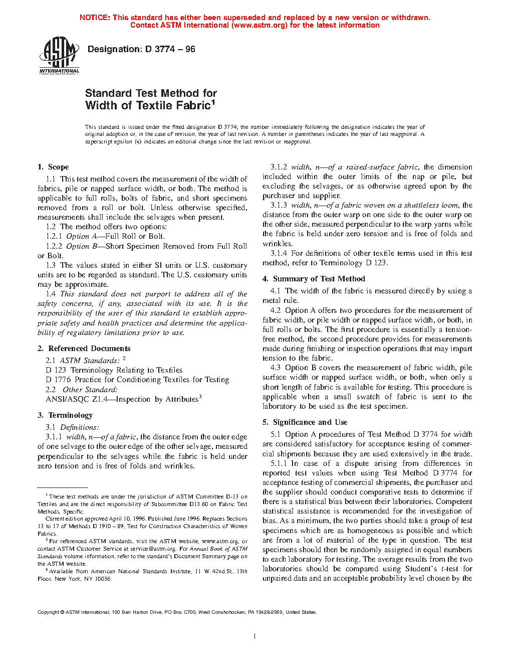 5.1 Option A procedures of Test Method D3774 for width are considered satisfactory for acceptance testing of commercial shipments because they are used extensively in the trade.