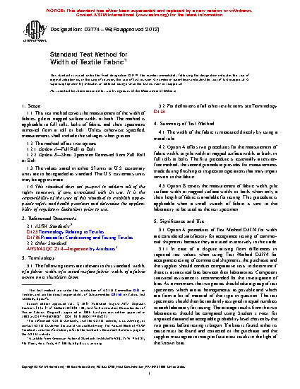 1.1 This test method covers the measurement of the width of woven or knitted fabrics, usable width, or both. The method is applicable to full rolls, bolts of fabric, and short specimens removed from a roll or bolt. Unless otherwise specified, measurements shall include the selvages when present.