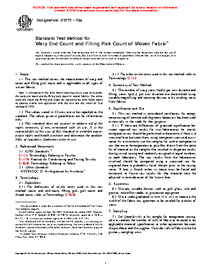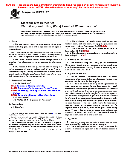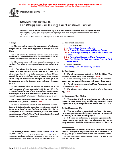 1.1 This test method covers the measurement of end (warp) and pick (filling) count and is applicable to all types of woven fabrics.