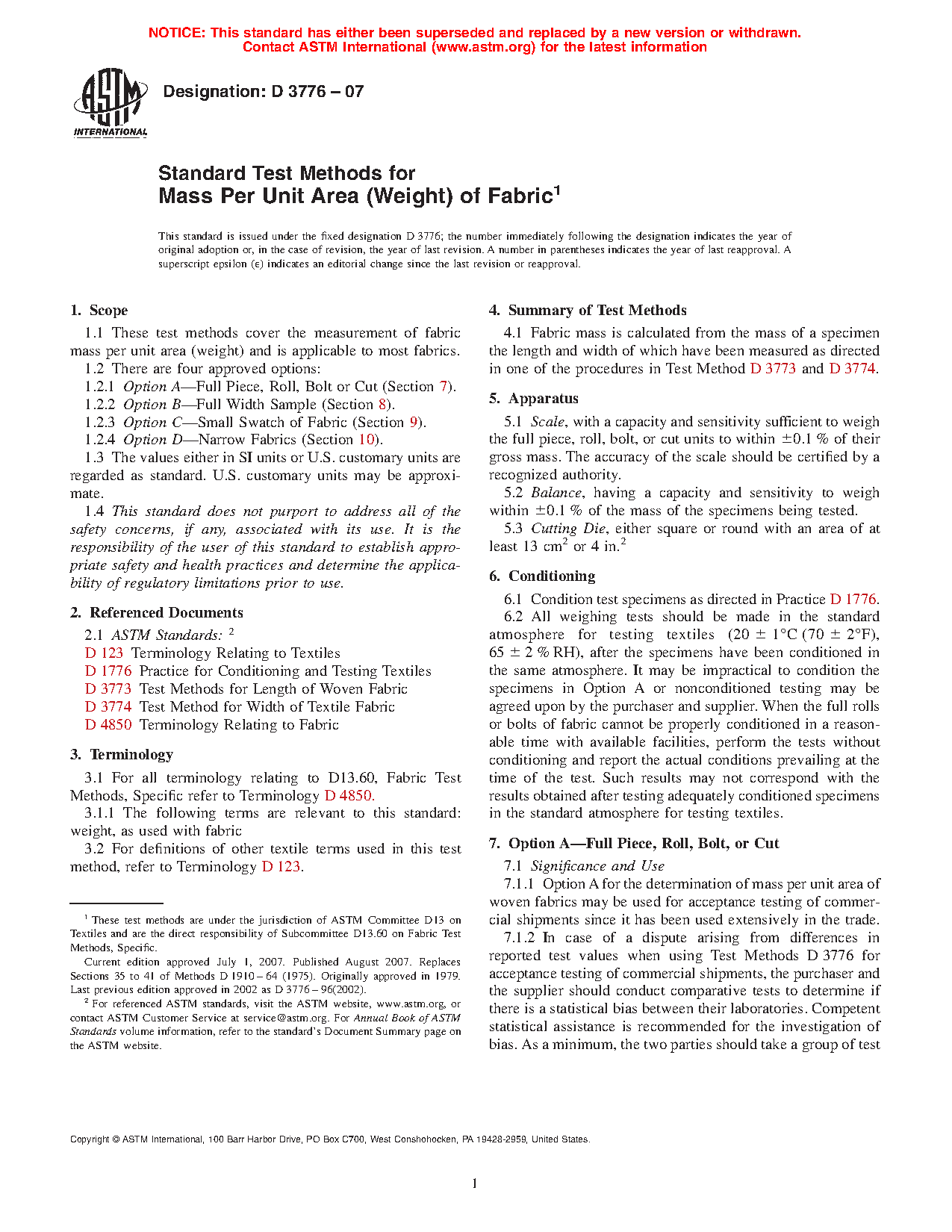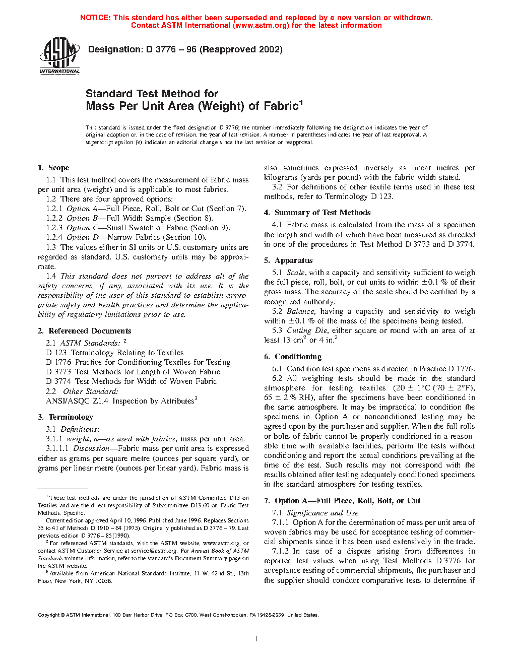 These test methods cover the measurement of fabric mass per unit area (weight) and is applicable to most fabrics. There are four approved options in the measurement of fabric mass per unit area: Option A, Option B, Option C, and Option D. Option A may be used for acceptance testing of commercial shipments since it has been used extensively in the trade. The second option is Option B which is applicable to a full-width sample cut from a full piece, roll, bolt, or cut. Unless otherwise specified, these results will include selvages and will be on the basis of conditioned fabric. Option C on the other hand is applicable when a small swatch of fabric is sent to the laboratory to be used as the test specimen. The results are considered to be applicable to the sample only and not necessarily to the lot from which the sample was taken. Measurements by this method do not include selvages and should be reported as such, unless a selvage allowance is specified. The last option is Option D which is intended for use with narrow fabrics as so designated by the trade.