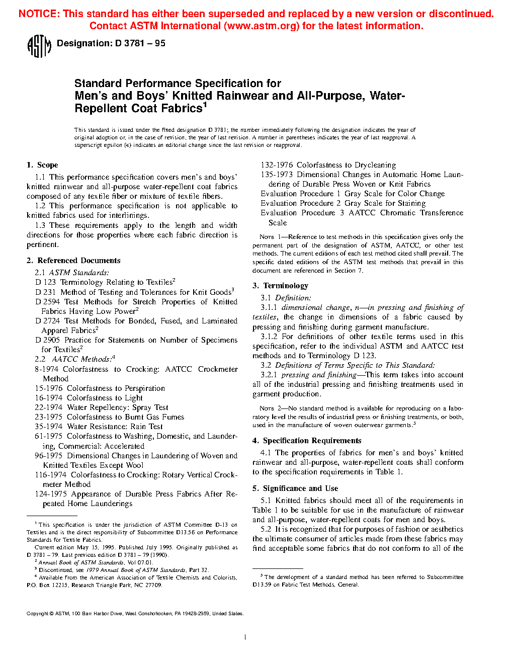 1.1 This performance specification covers men's and boys' knitted rainwear and all-purpose water-repellent coat fabrics composed of any textile fiber or mixture of textile fibers.