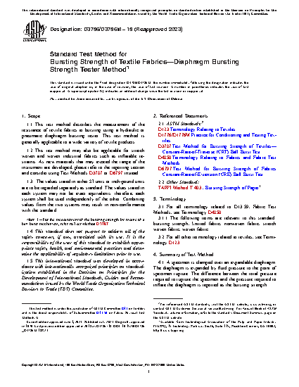 1.1 This test method describes the measurement of the resistance of textile fabrics to bursting using a hydraulic or pneumatic diaphragm bursting tester. This test method is generally applicable to a wide variety of textile products.