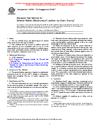 1.1 This test method covers the determination of volatile matter (moisture) in all types of leather.