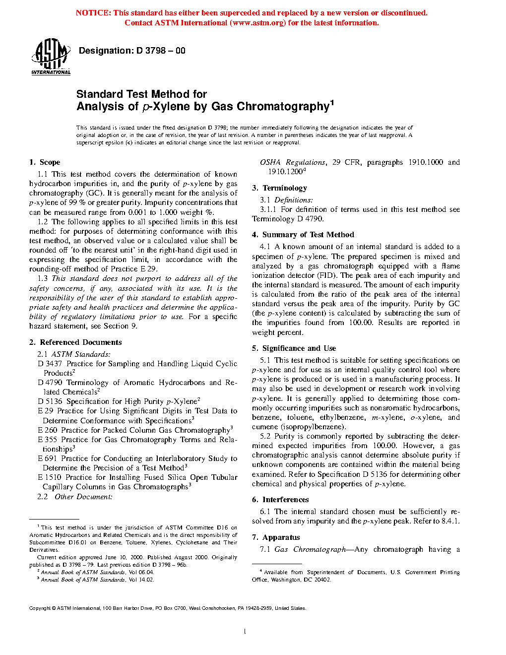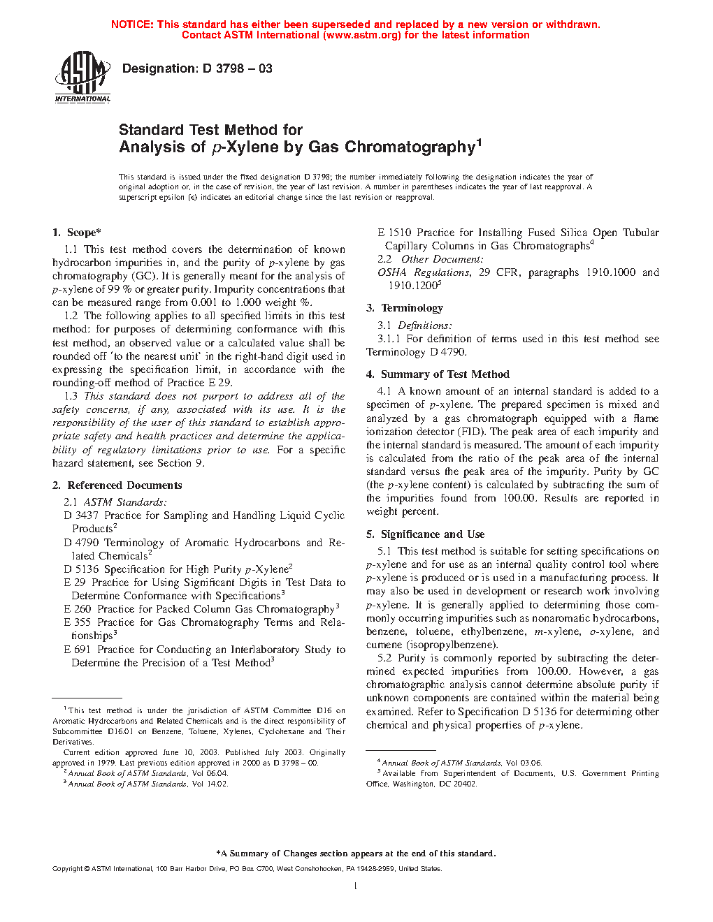 1.1 This test method covers the determination of known hydrocarbon impurities in, and the purity of -xylene by gas chromatography (GC). It is generally meant for the analysis of -xylene of 99% or greater purity. Impurity concentrations that can be measured range from 0.001 to 1.000 weight %.