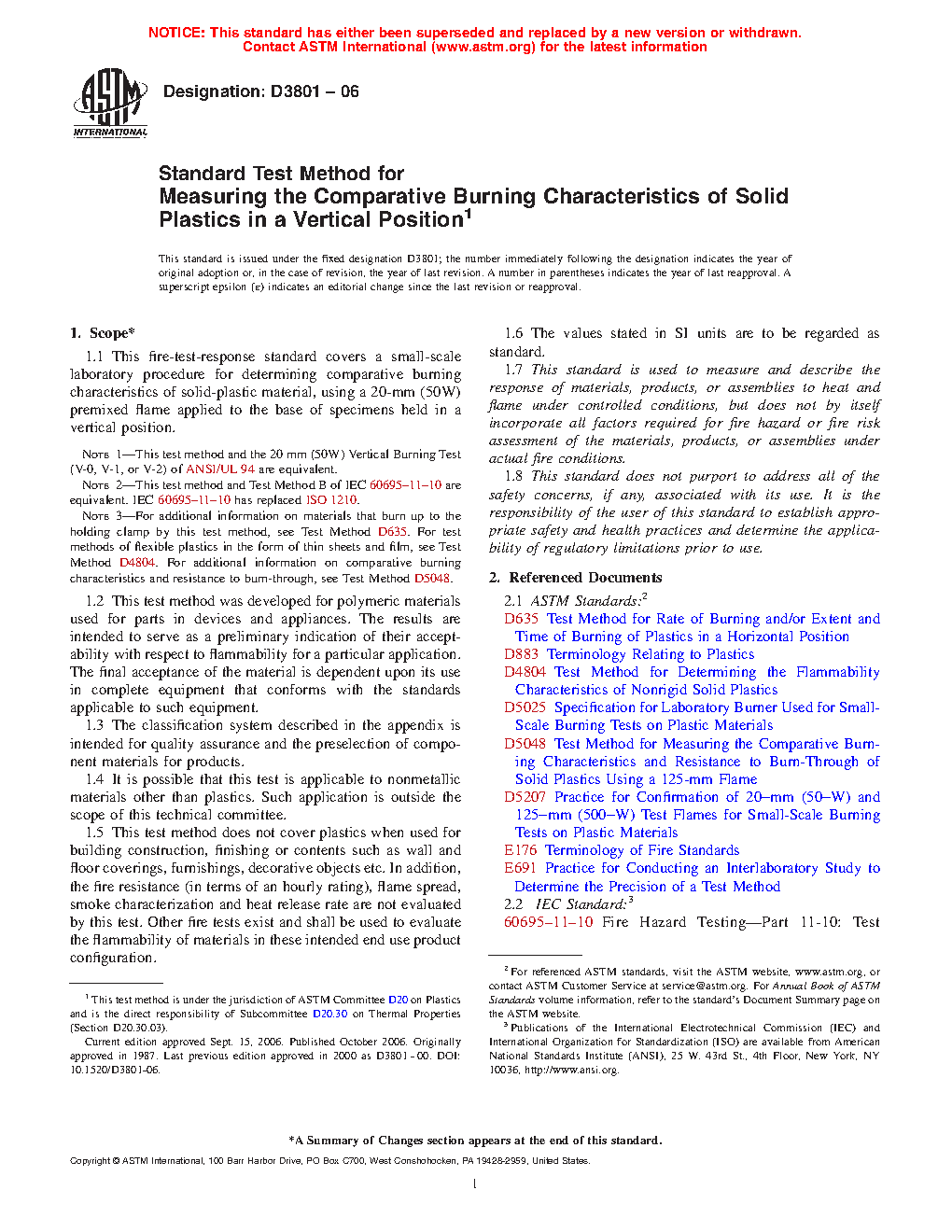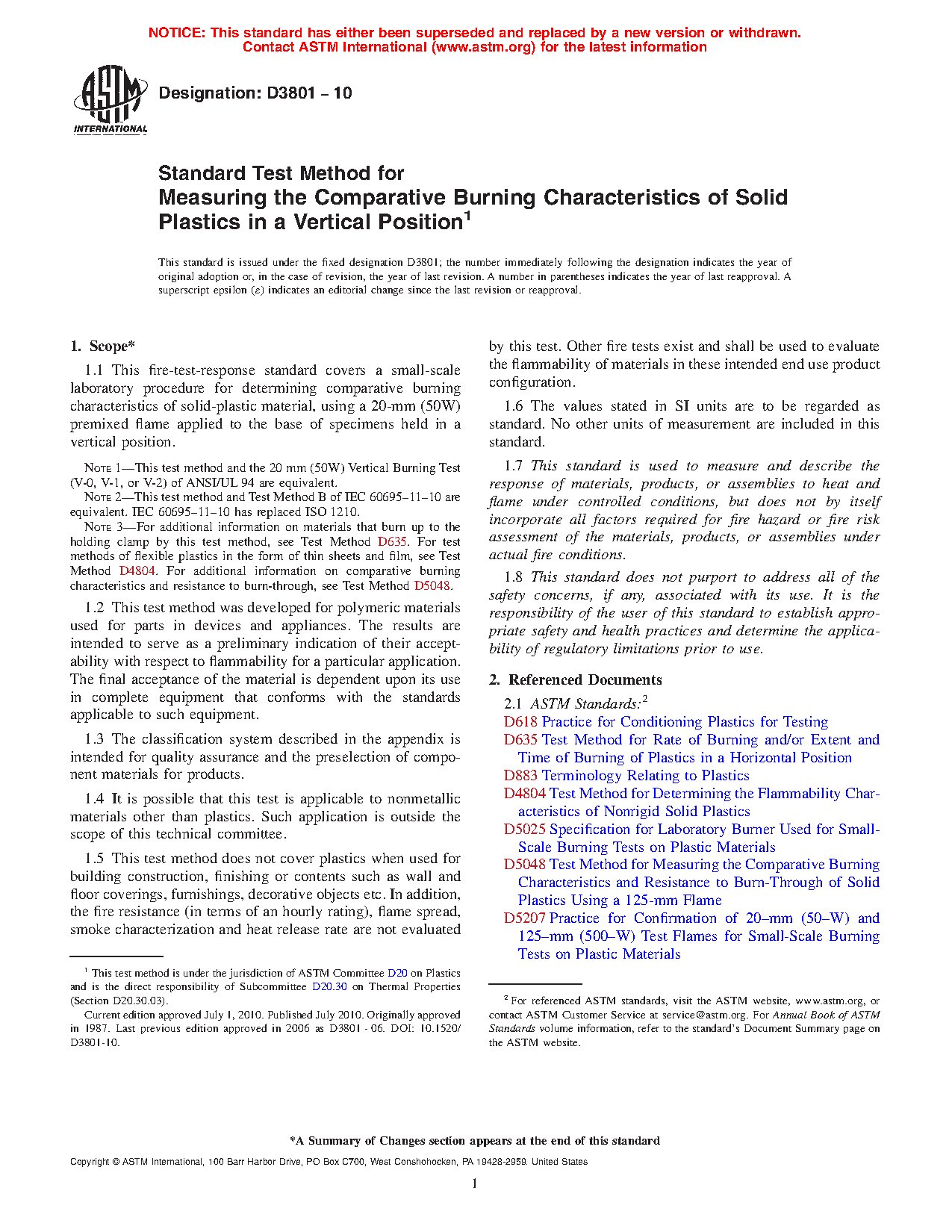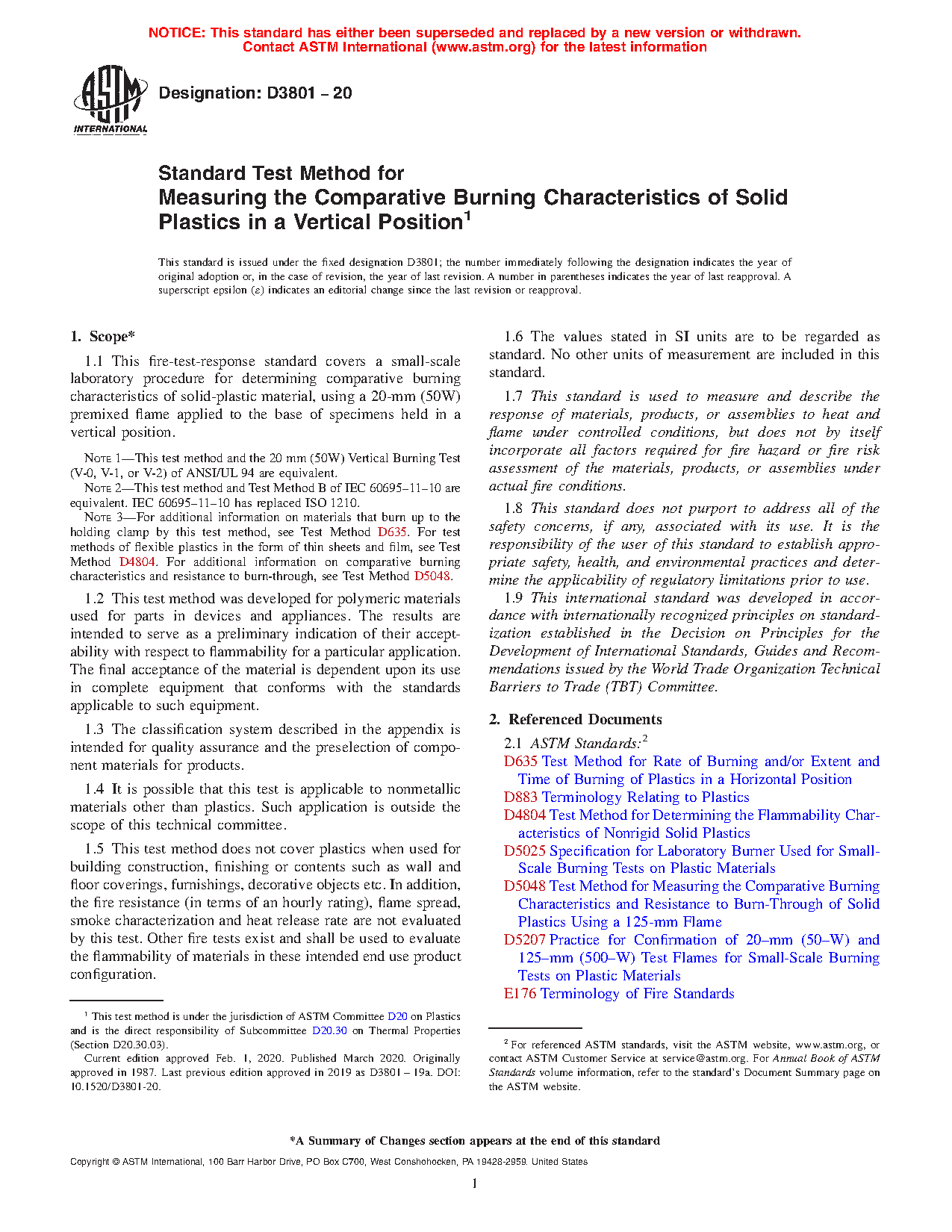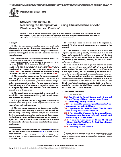 1.1 This fire-test-response standard covers a small-scale laboratory procedure for determining comparative burning characteristics of solid-plastic material, using a 20-mm (50W) premixed flame applied to the base of specimens held in a vertical position.