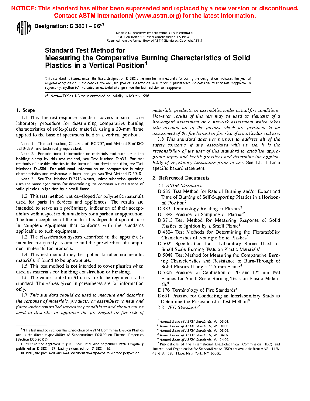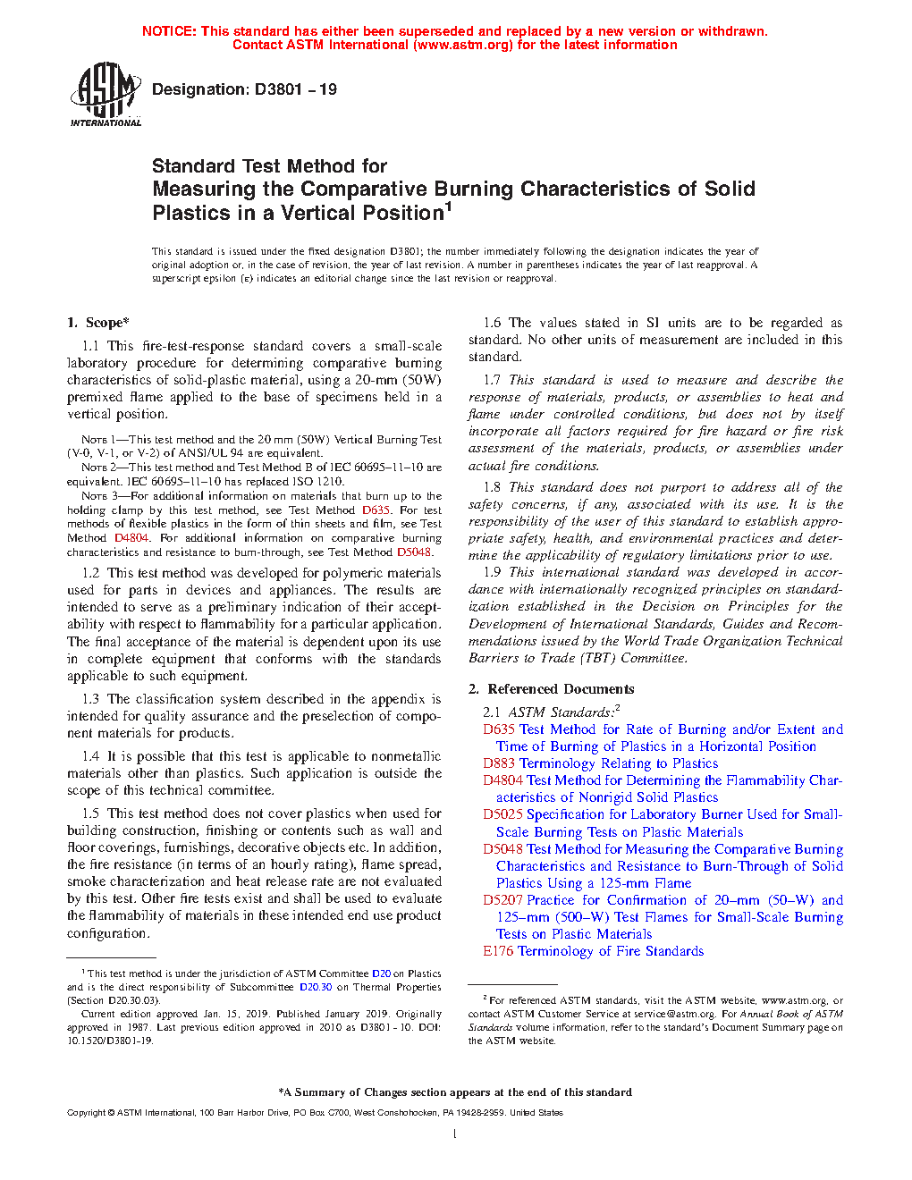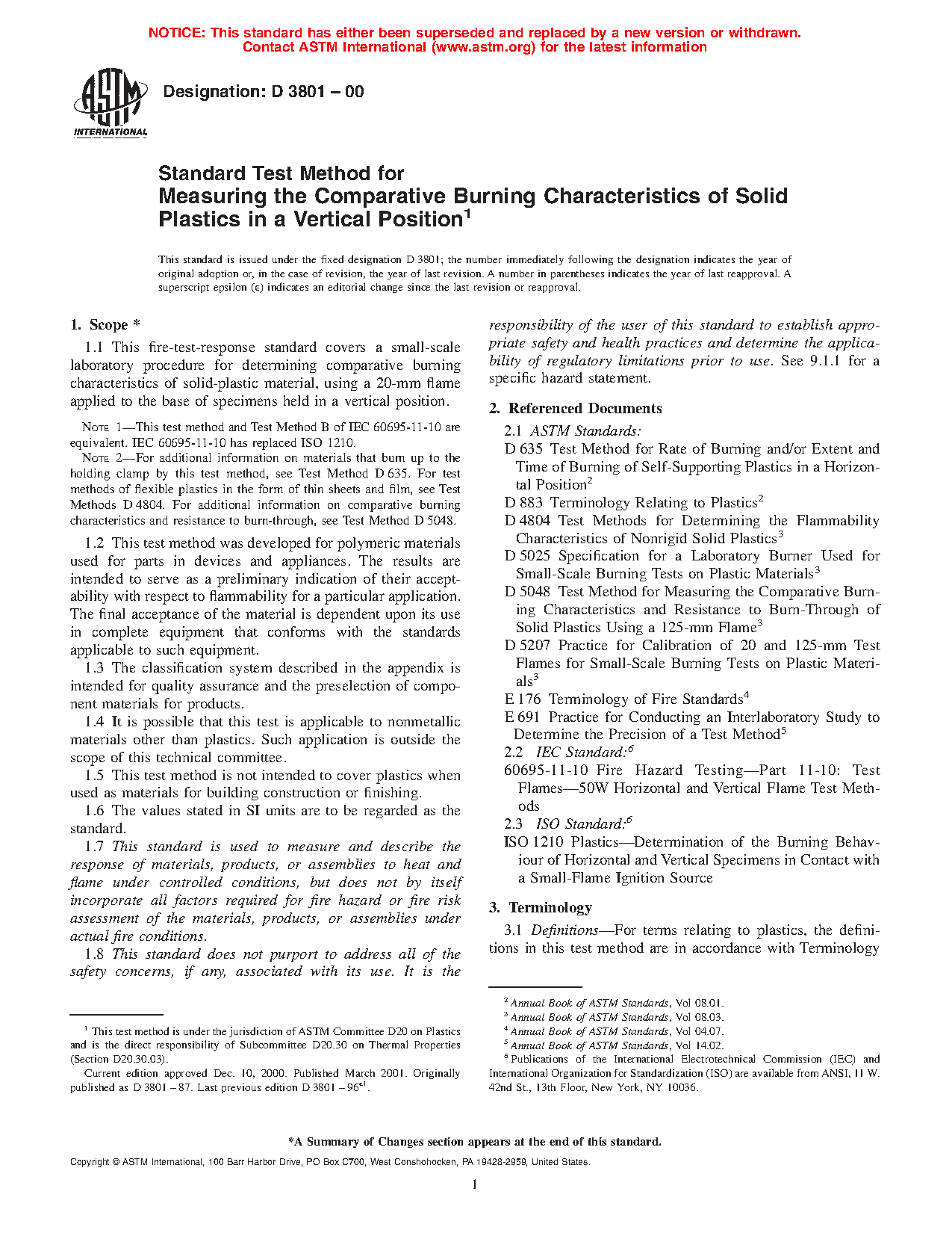 1.1 This fire-test-response standard covers a small-scale laboratory procedure for determining comparative burning characteristics of solid-plastic material, using a 20-mm (50W) premixed flame applied to the base of specimens held in a vertical position.