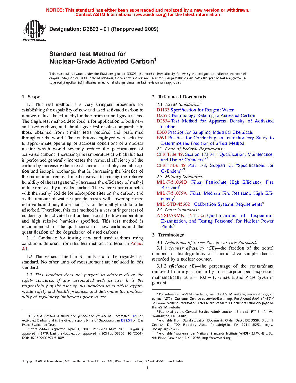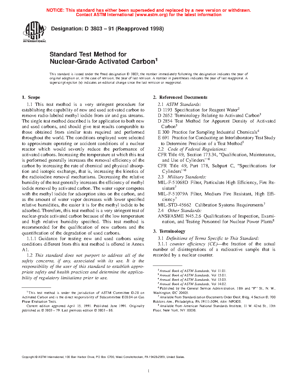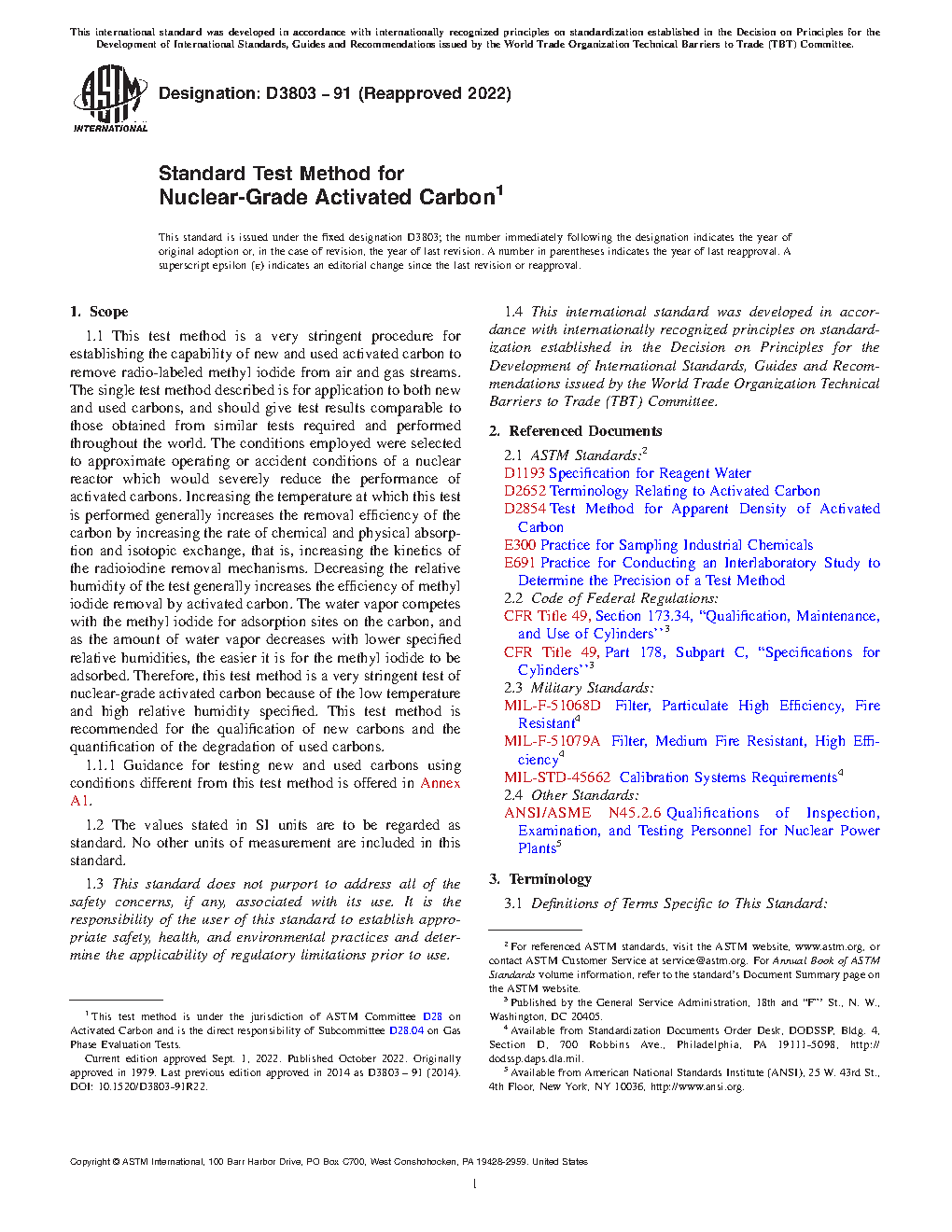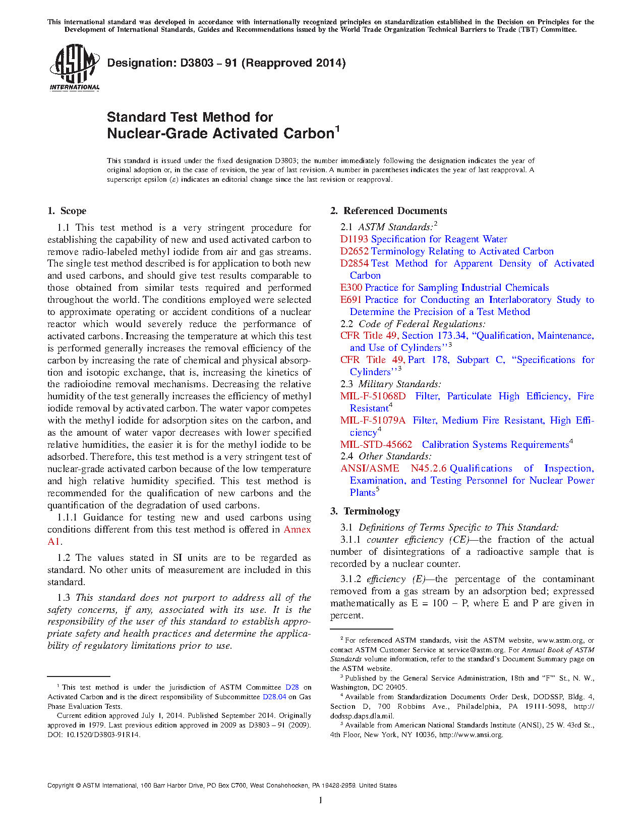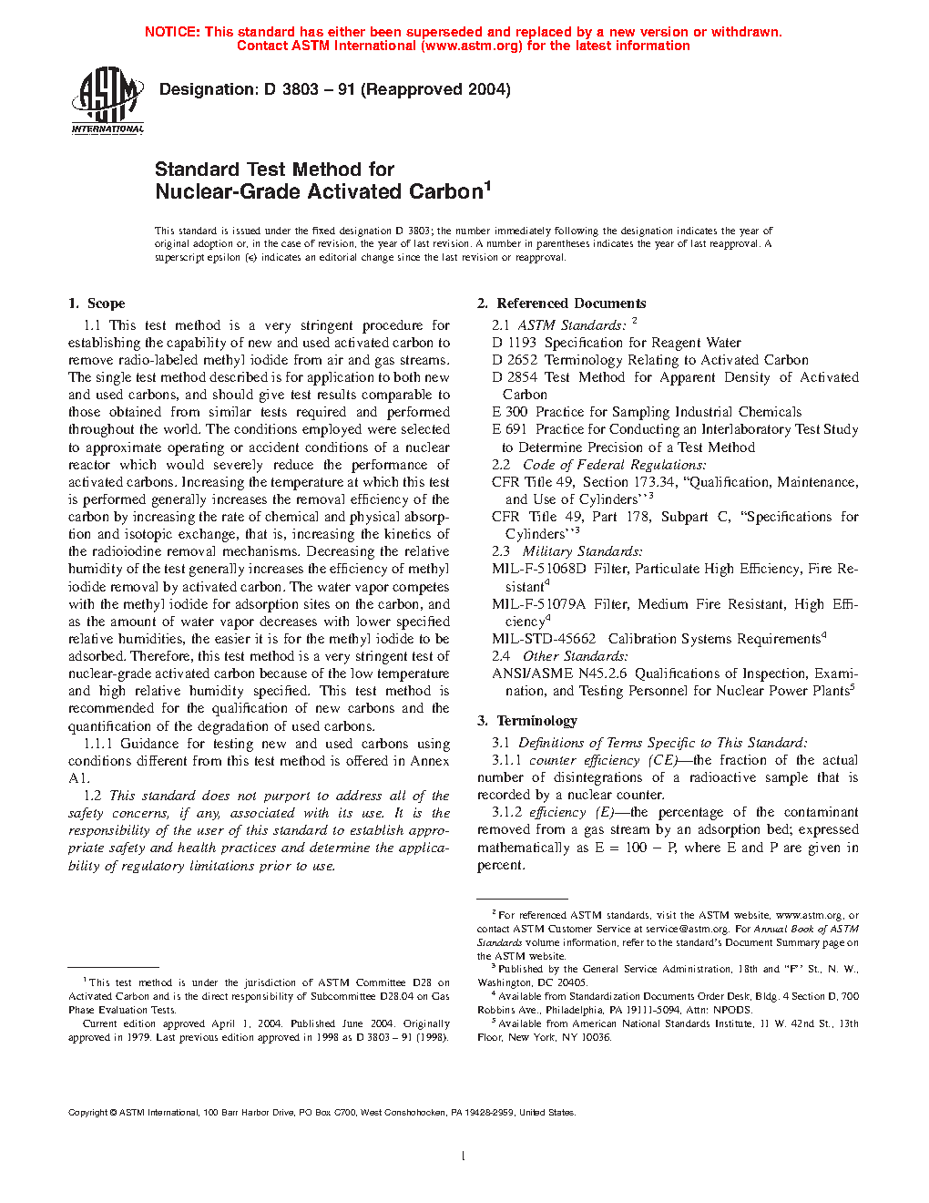 1.1 This test method is a very stringent procedure for establishing the capability of new and used activated carbon to remove radio-labeled methyl iodide from air and gas streams. The single test method described is for application to both new and used carbons, and should give test results comparable to those obtained from similar tests required and performed throughout the world. The conditions employed were selected to approximate operating or accident conditions of a nuclear reactor which would severely reduce the performance of activated carbons. Increasing the temperature at which this test is performed generally increases the removal efficiency of the carbon by increasing the rate of chemical and physical absorption and isotopic exchange, that is, increasing the kinetics of the radioiodine removal mechanisms. Decreasing the relative humidity of the test generally increases the efficiency of methyl iodide removal by activated carbon. The water vapor competes with the methyl iodide for adsorption sites on the carbon, and as the amount of water vapor decreases with lower specified relative humidities, the easier it is for the methyl iodide to be adsorbed. Therefore, this test method is a very stringent test of nuclear-grade activated carbon because of the low temperature and high relative humidity specified. This test method is recommended for the qualification of new carbons and the quantification of the degradation of used carbons.