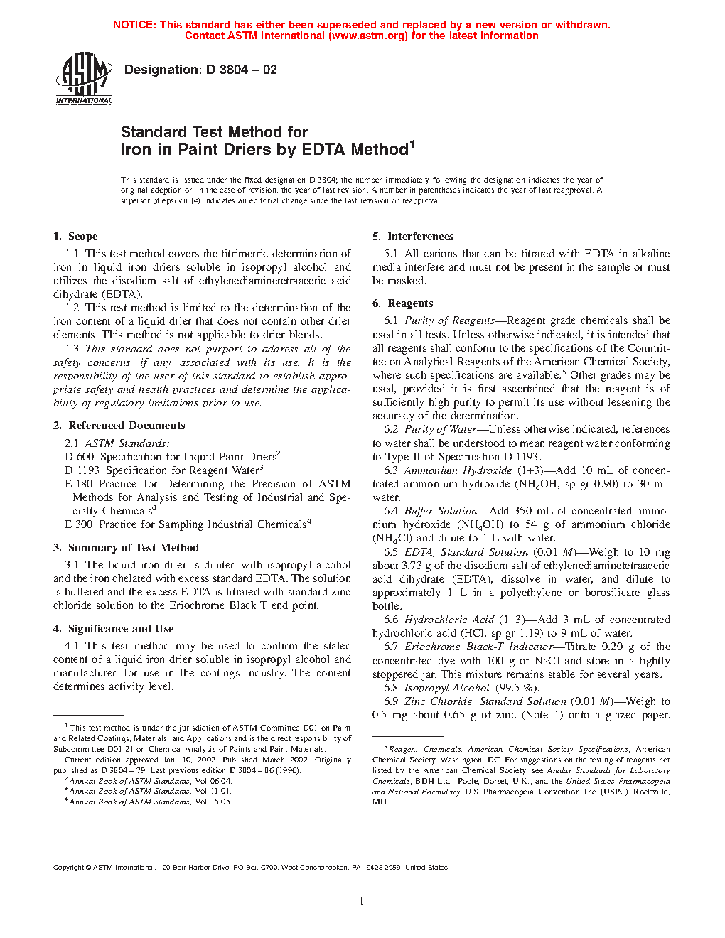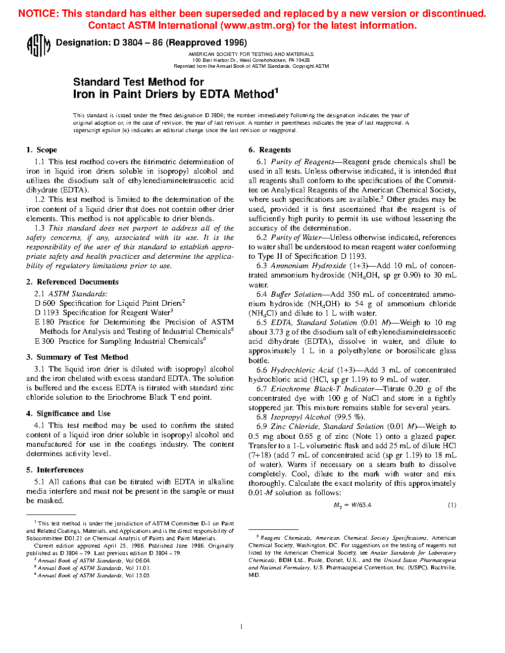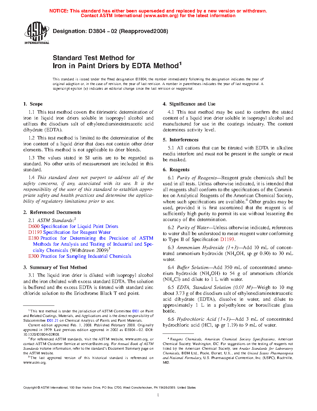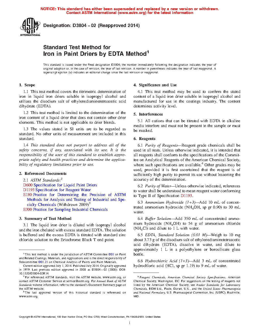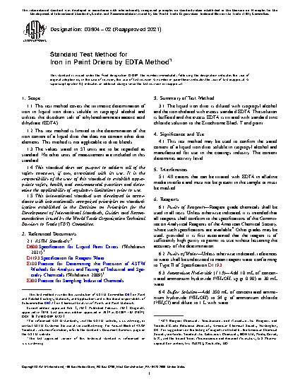 1.1 This test method covers the titrimetric determination of iron in liquid iron driers soluble in isopropyl alcohol and utilizes the disodium salt of ethylenediaminetetraacetic acid dihydrate (EDTA).