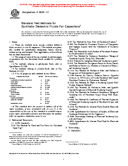 1.1 These test methods cover testing synthetic dielectric fluids currently in use for capacitors. The methods are generally suitable for specification acceptance, factory control, referee testing, and research. Their applicability to future fluids has not been determined.