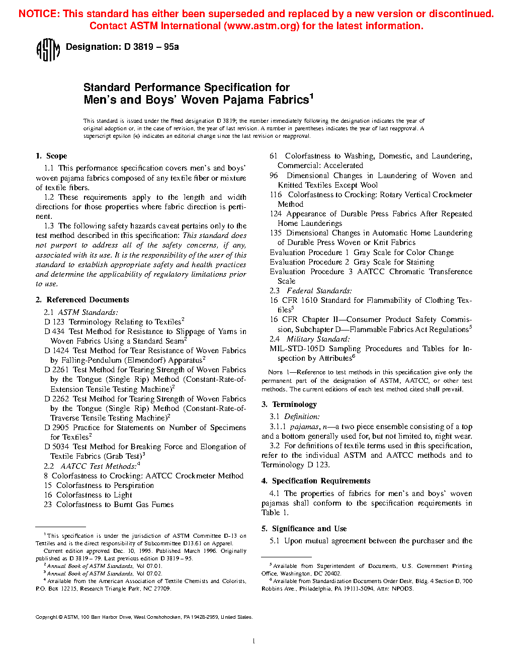 Standard Performance Specification for Men's and Boys' Woven Pajama Fabrics