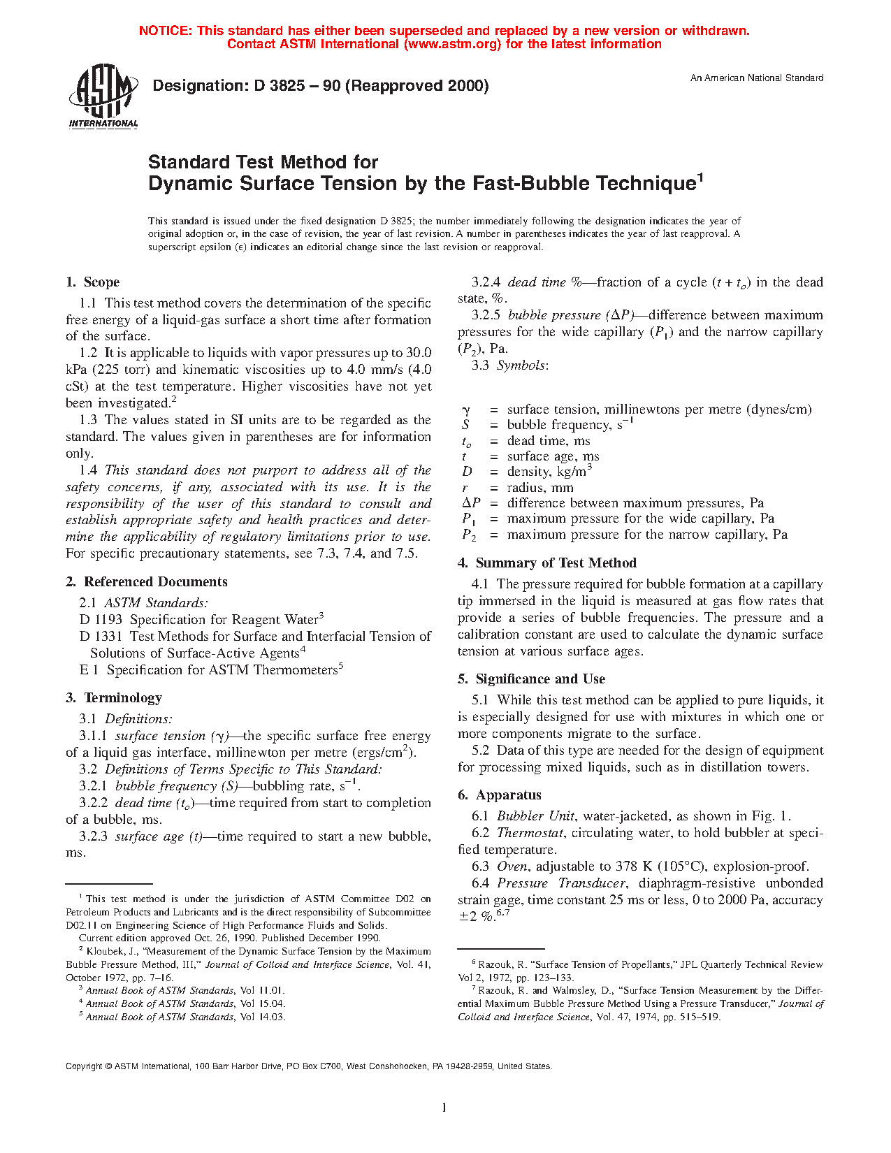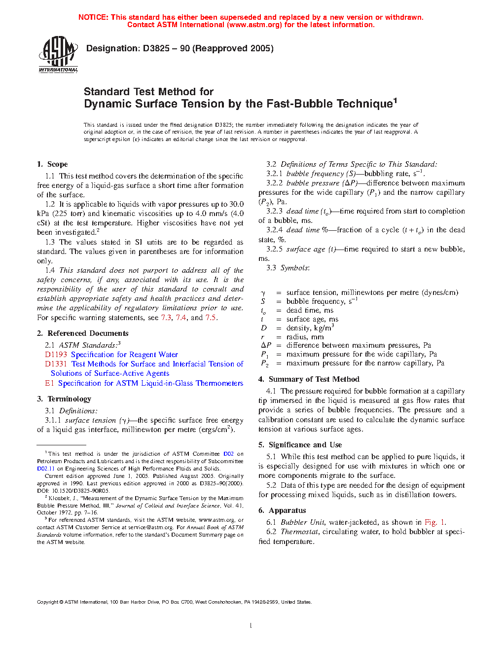 1.1 This test method covers the determination of the specific free energy of a liquid-gas surface a short time after formation of the surface.