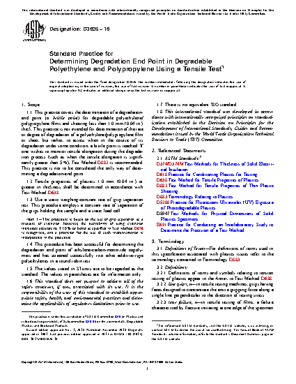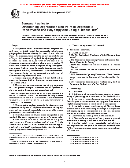 1.1 This practice covers the determination of a degradation-end point ( a brittle point ) for degradable polyethylene/ polypropylene films and sheeting less than 1.0 mm (0.04 in.) thick. This practice is not intended for determination of the rate of degree of degradation of a polyethylene/ polypropylene film or sheet, but rather, to assess when in the course of its degradation under some condition, a brittle point is reached. If one wishes to monitor tensile elongation during the degradation process (such as when the tensile elongation is significantly greater than 5%), Test Method D882 is recommended. This practice should not be considered the only way of determining a degradation-end point. Other degradation-end-point procedures are currently being evaluated and developed by Subcommittee D20.96 for polyolefins and other plastics such as polystyrene. For example, Test Method D1922 is being considered as a test for determining a degradation-end point in polyethylene/ polypropylene films. Practice D1435 may be used for determining outdoor weathering of polyethylene/ polypropylene films and sheeting.