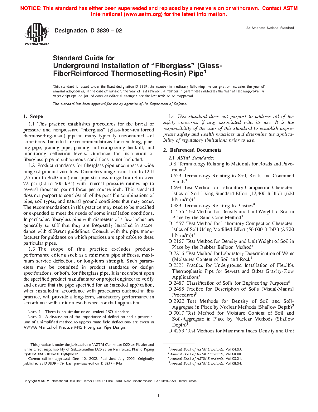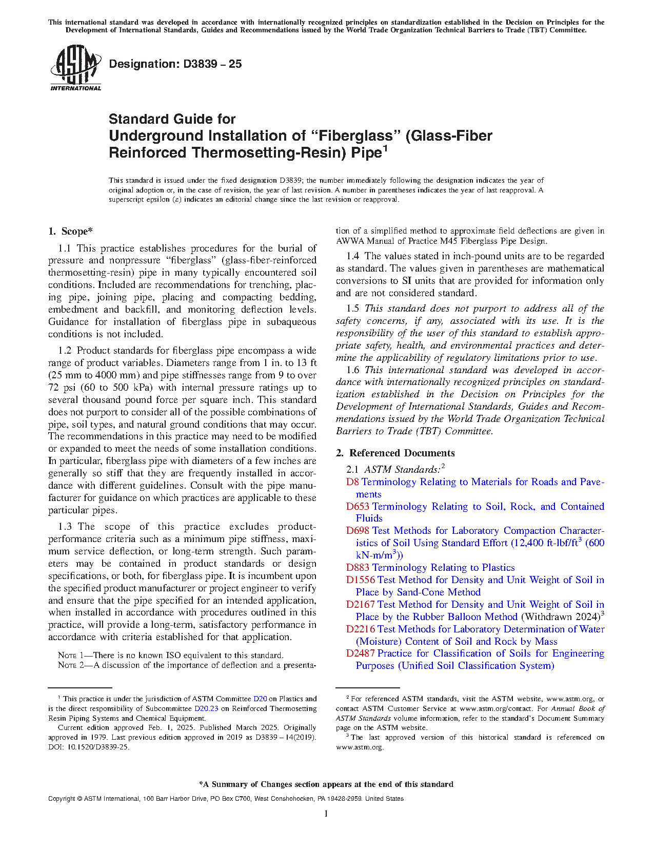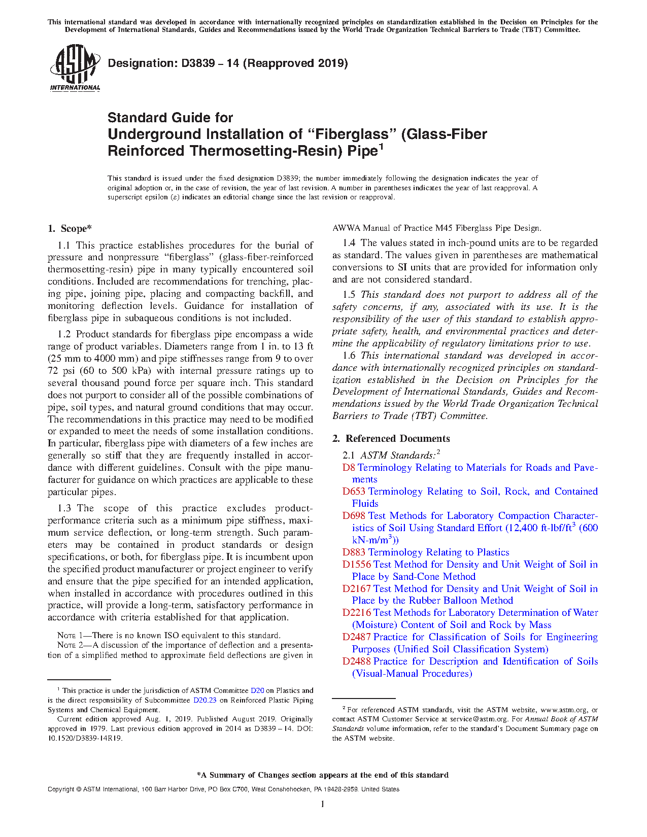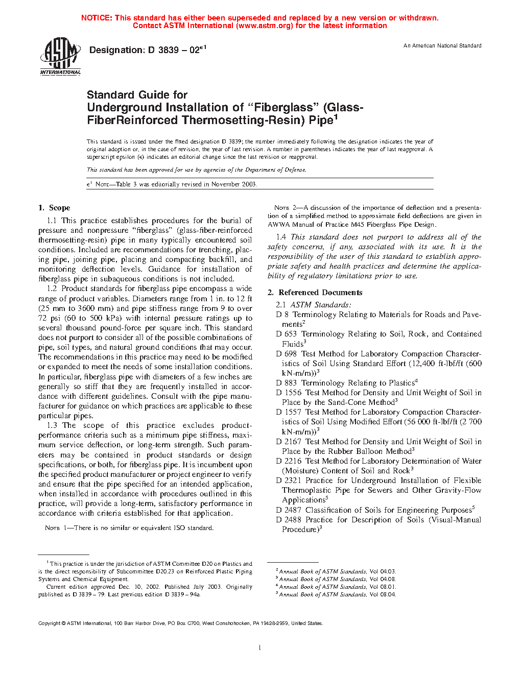 1.1 This practice establishes procedures for the burial of pressure and nonpressure “fiberglass” (glass-fiber-reinforced thermosetting-resin) pipe in many typically encountered soil conditions. Included are recommendations for trenching, placing pipe, joining pipe, placing and compacting backfill, and monitoring deflection levels. Guidance for installation of fiberglass pipe in subaqueous conditions is not included.