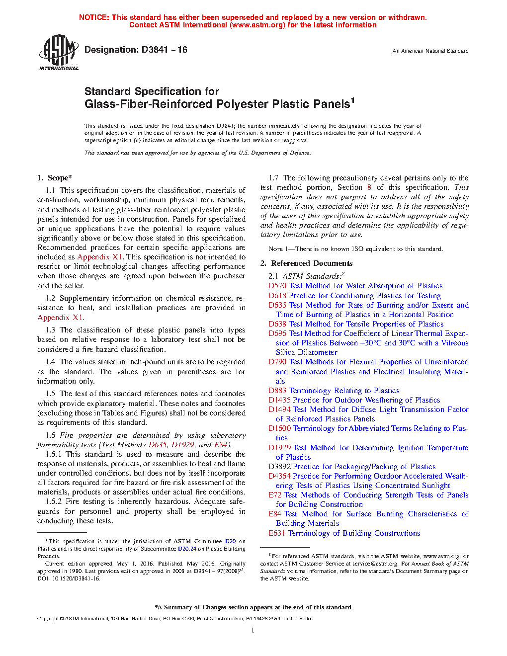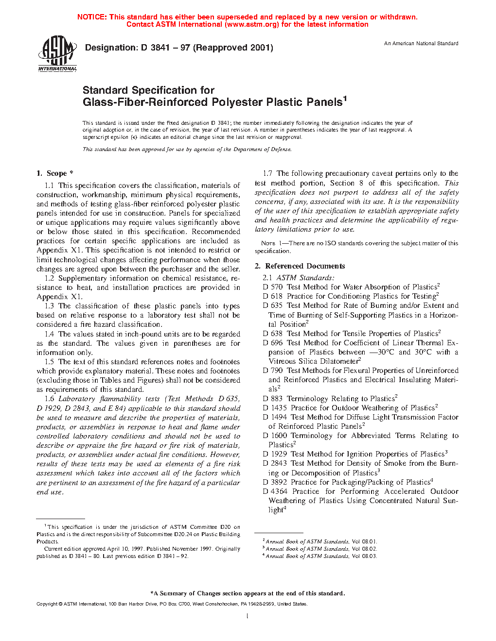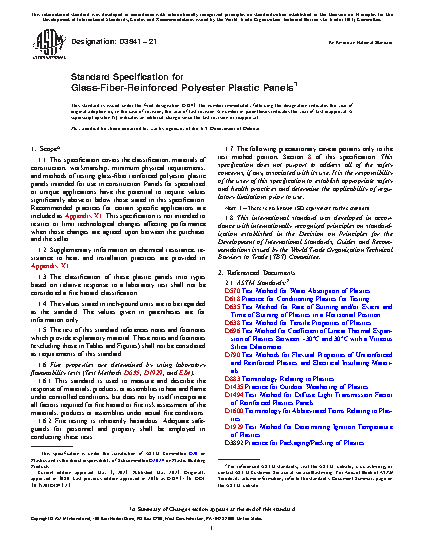 1.1 This specification covers the classification, materials of construction, workmanship, minimum physical requirements, and methods of testing glass-fiber reinforced polyester plastic panels intended for use in construction. Panels for specialized or unique applications may require values significantly above or below those stated in this specification. Recommended practices for certain specific applications are included as Appendix X1. This specification is not intended to restrict or limit technological changes affecting performance when those changes are agreed upon between the purchaser and the seller.