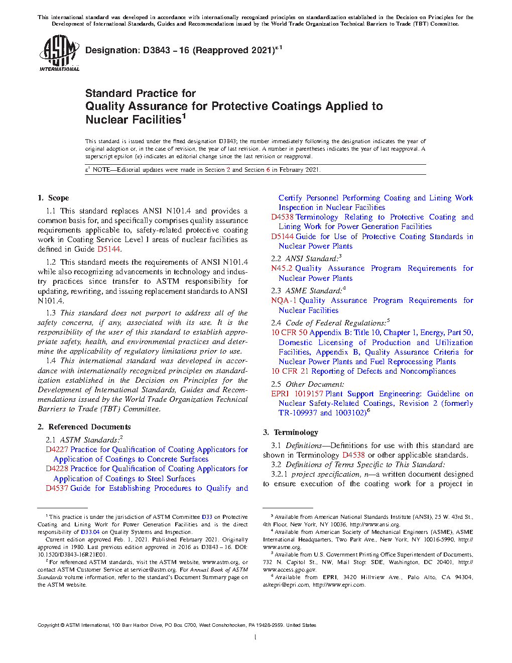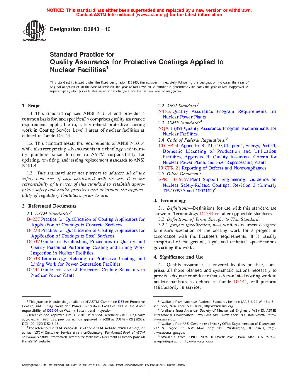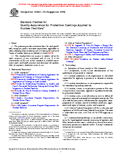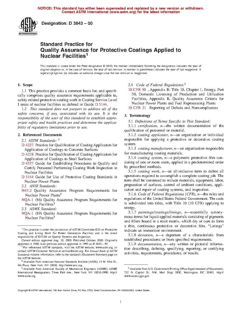 1.1 This standard replaces ANSI N101.4 and provides a common basis for, and specifically comprises quality assurance requirements applicable to, safety-related protective coating work in Coating Service Level I areas of nuclear facilities as defined in Guide D5144.