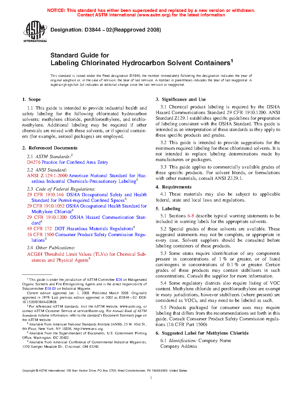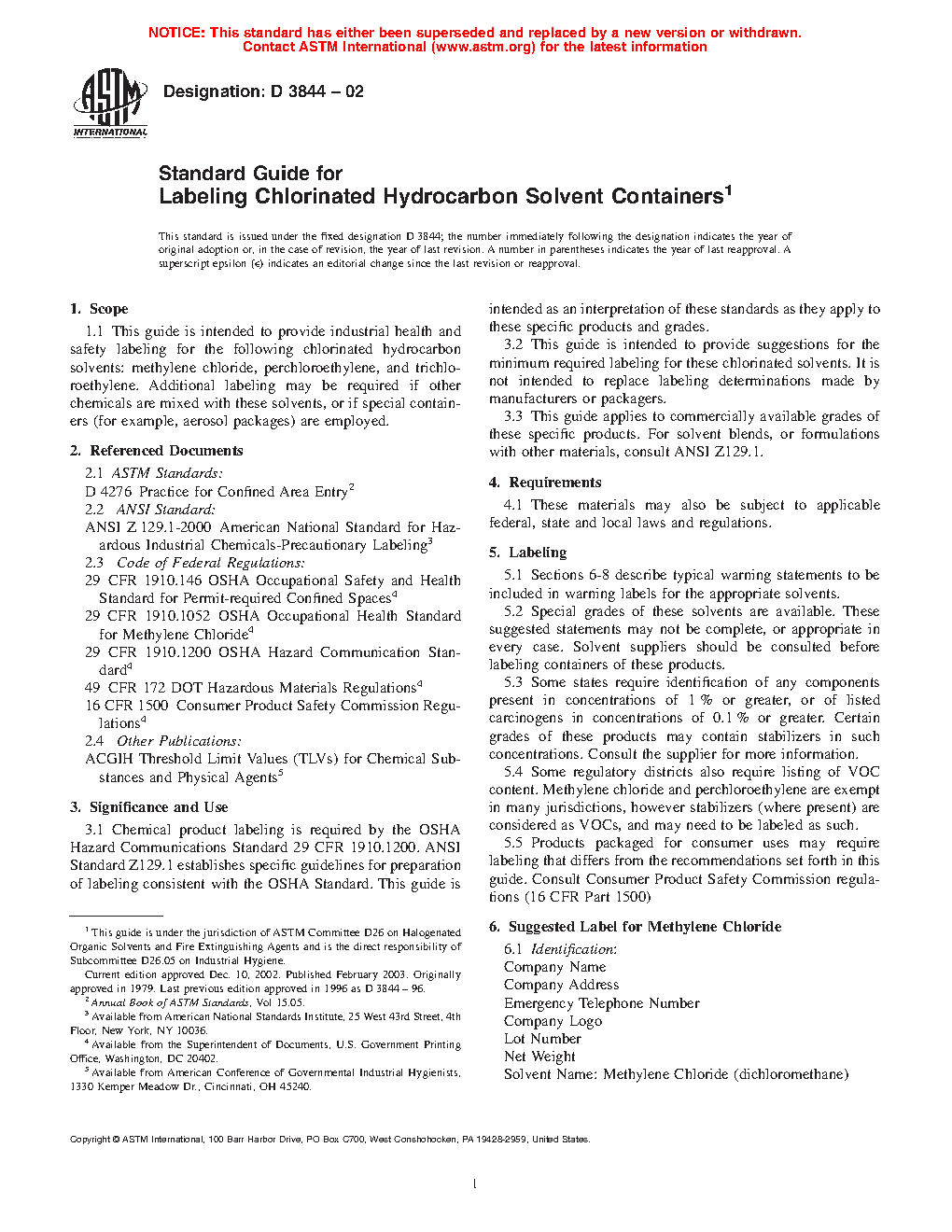 1.1 This guide is intended to provide industrial health and safety labeling for the following chlorinated hydrocarbon solvents: methylene chloride, perchloroethylene, and trichloroethylene. Additional labeling may be required if other chemicals are mixed with these solvents, or if special containers (for example, aerosol packages) are employed.